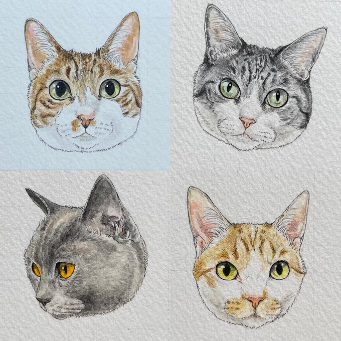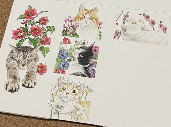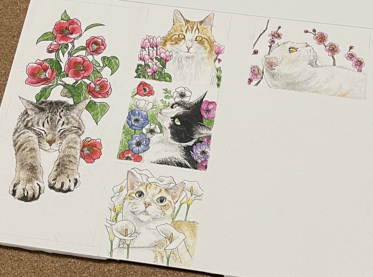 4 20 ミニ原画6点、最後の絵が陽が沈む前に終わらず〜😂 1日に塗った数では最多でした(笑) 日の光の元で写真撮りたいので、ツイートは明日以降に順次🤲 過去に描いた1点をプラスして、7点をミニ原画展に出します! #水彩画 #猫イラスト 23/01/03 21:26