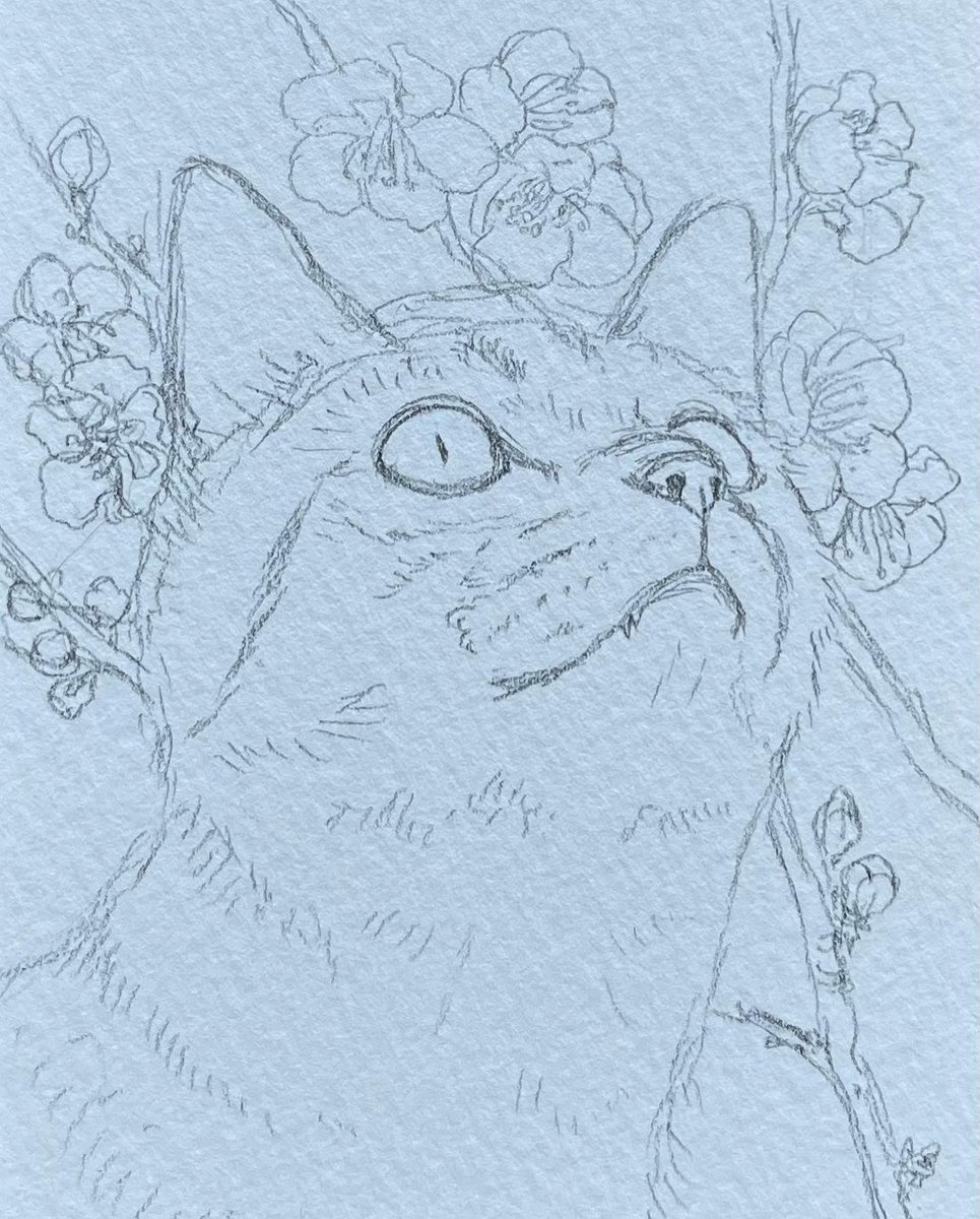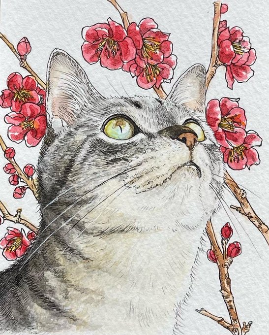 3 17 【猫と梅の花】 @fukufuku317 さんのお家のみのる君🍀 年が明けたばかりですが、春を迎えるために梅の花ー!【春夏秋冬ミニ原画展】の『冬』用の1点。 梅は好きな花の1つで何度も描いているんだけど、いつも新鮮な気持ちになります☺ #水彩画 #猫イラスト 23/01/10 08:57