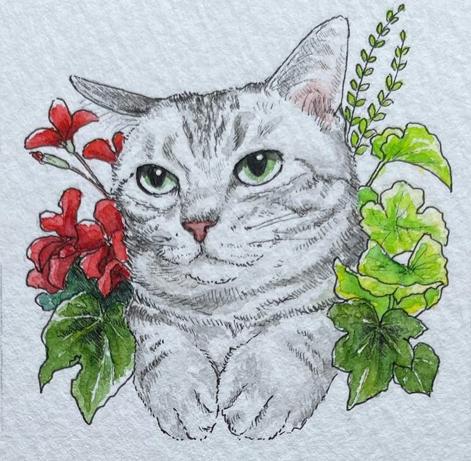 4 28 【ミニ原画】@tamakodiet1 さんのお家の次女ちゃん💕 おててちょこんと添えたポーズが可愛くて、描いててキュ━(*ノωヾ)━ン♡ な子でした😻 最近好きな赤いゼラニウムを添えて。 お待たせしてゴメンなさい🙏🏻モデルへのご応募ありがとうございました〜🍀 #水彩画 #猫イラスト 22/10/02 17:57