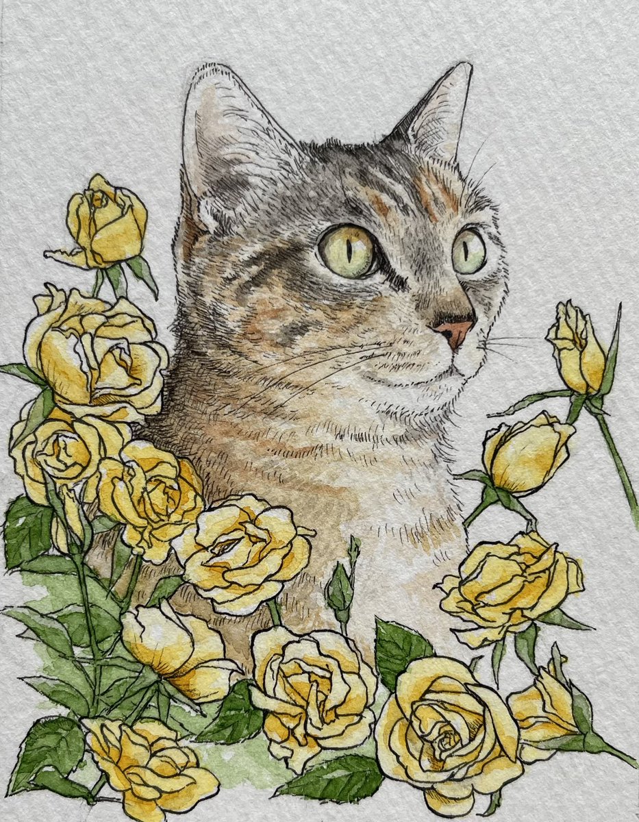 【ミニ原画】 昨日撮った レヨン ドゥ ソレイユ という種類を早速描いてみました。 …バラ🌹…むずっ😇😇 今までも描いた事はあるけど、改めて真面目に描くと難しい花だなぁって思わされます。 #水彩画 #猫イラスト #猫とバラ