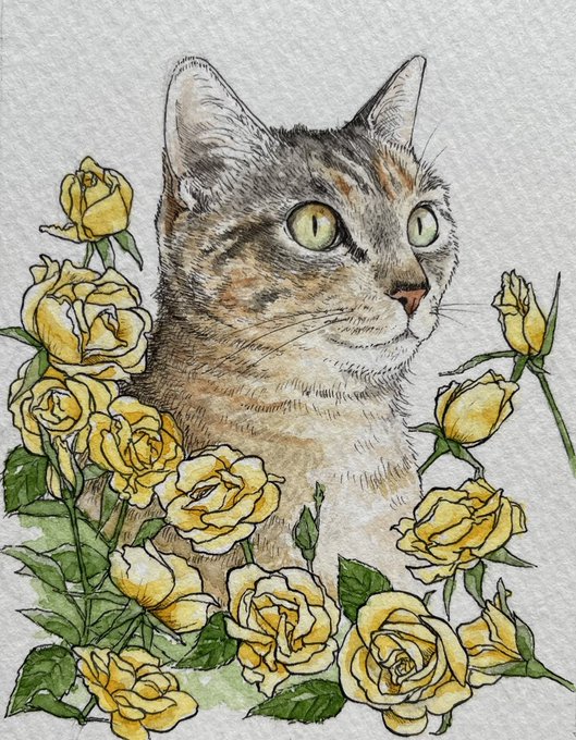 1 18 【ミニ原画】 昨日撮った レヨン ドゥ ソレイユ という種類を早速描いてみました。 …バラ🌹…むずっ😇😇 今までも描いた事はあるけど、改めて真面目に描くと難しい花だなぁって思わされます。 #水彩画 #猫イラスト #猫とバラ 22/10/09 11:48
