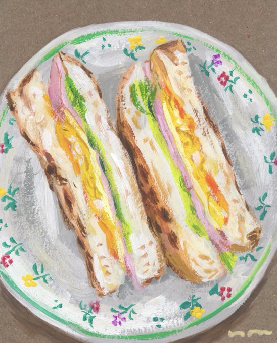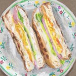 本日描いたのは、 「勢いまかせのサンドウィッチ」でした。 お買い上げありがとうございました。 また次回お会いしましょう。 おやすみなさい。 #ちっちゃめ絵 #絵 #イラスト #illustration #食べもの #サンドウィッチ #ホットサンド #はらぺこめがねの直売所