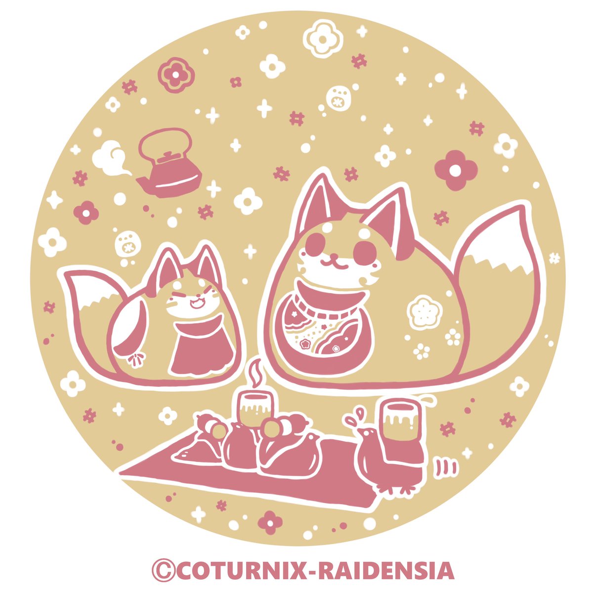 ウズラのお茶屋さんでおやつをいただくキツネちゃん達を描いてみました🦊🍡🍵 ウズラが背中にお茶やお団子を乗せて運んでくれます🐣