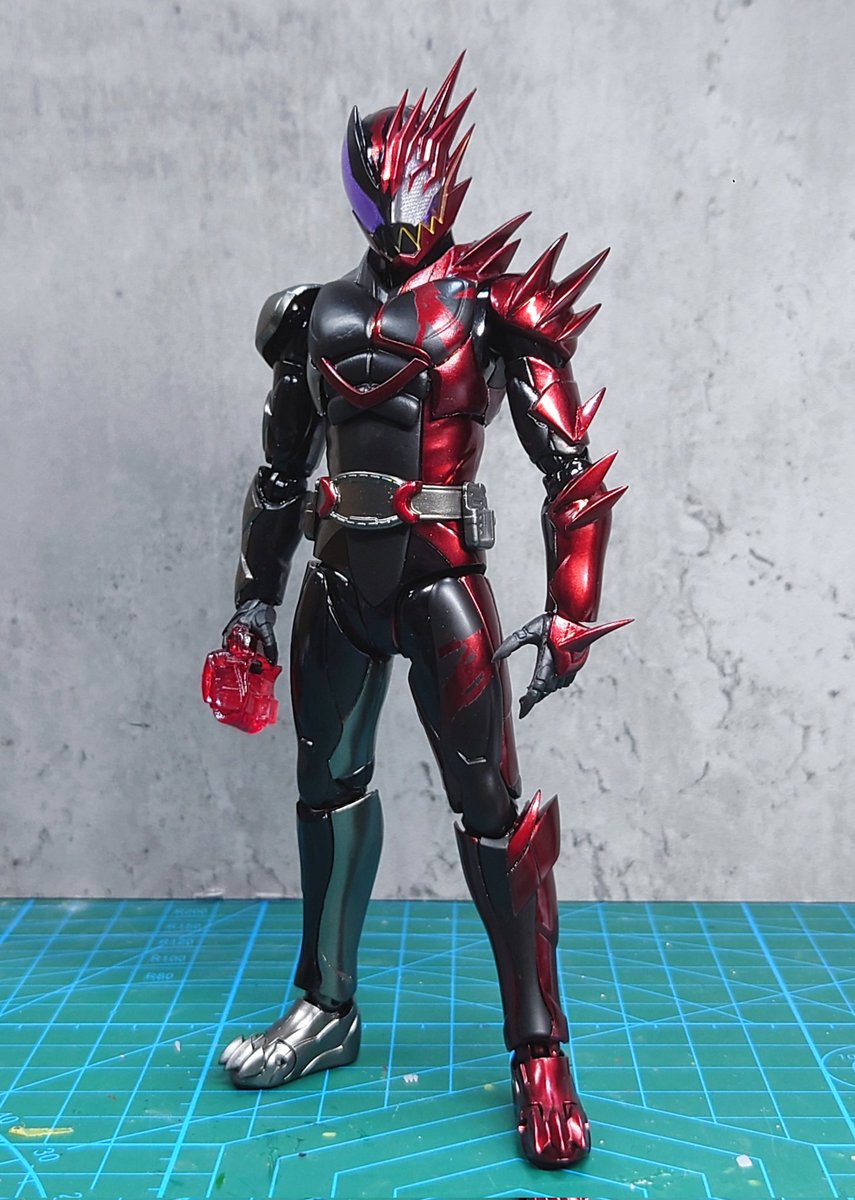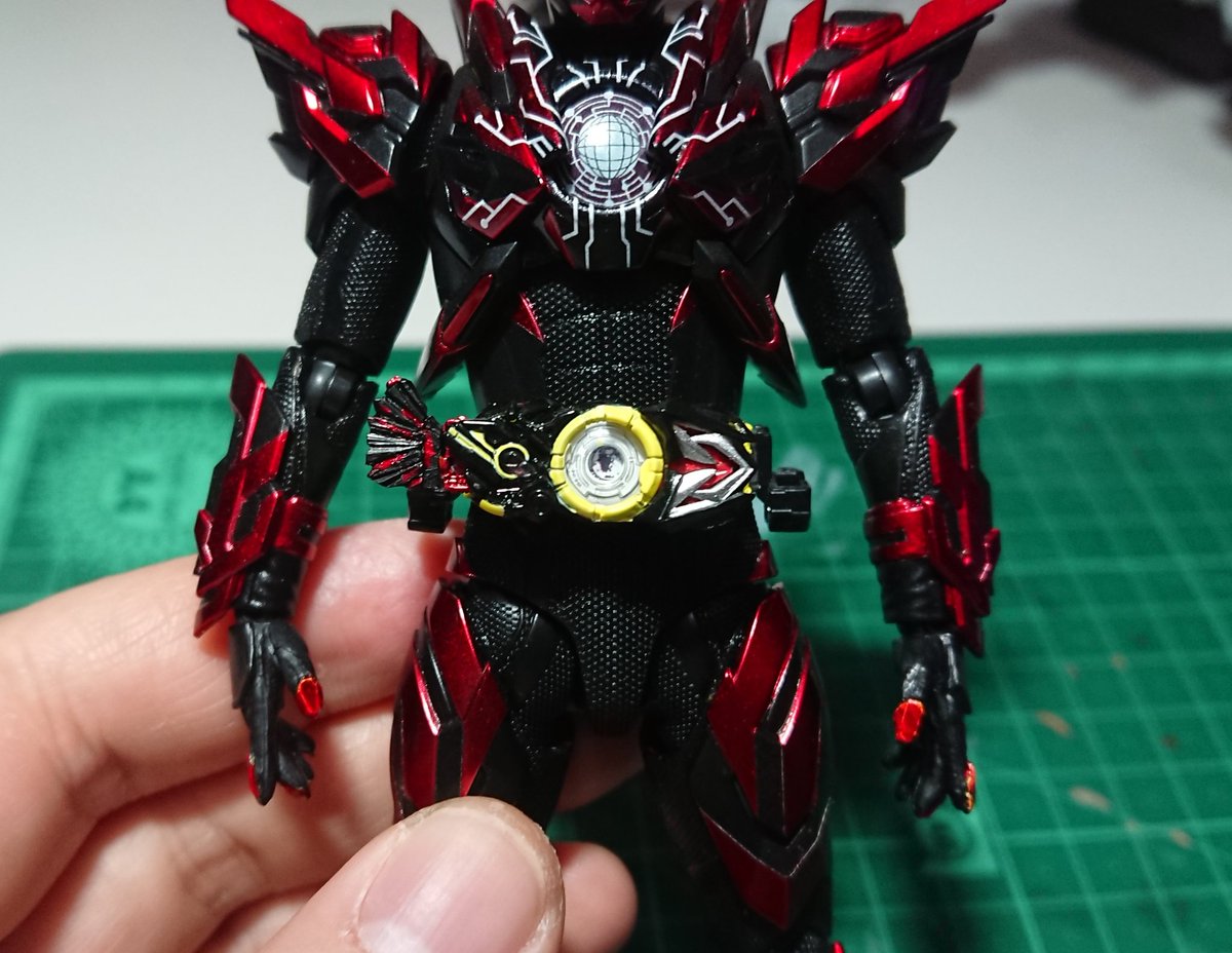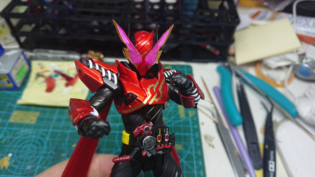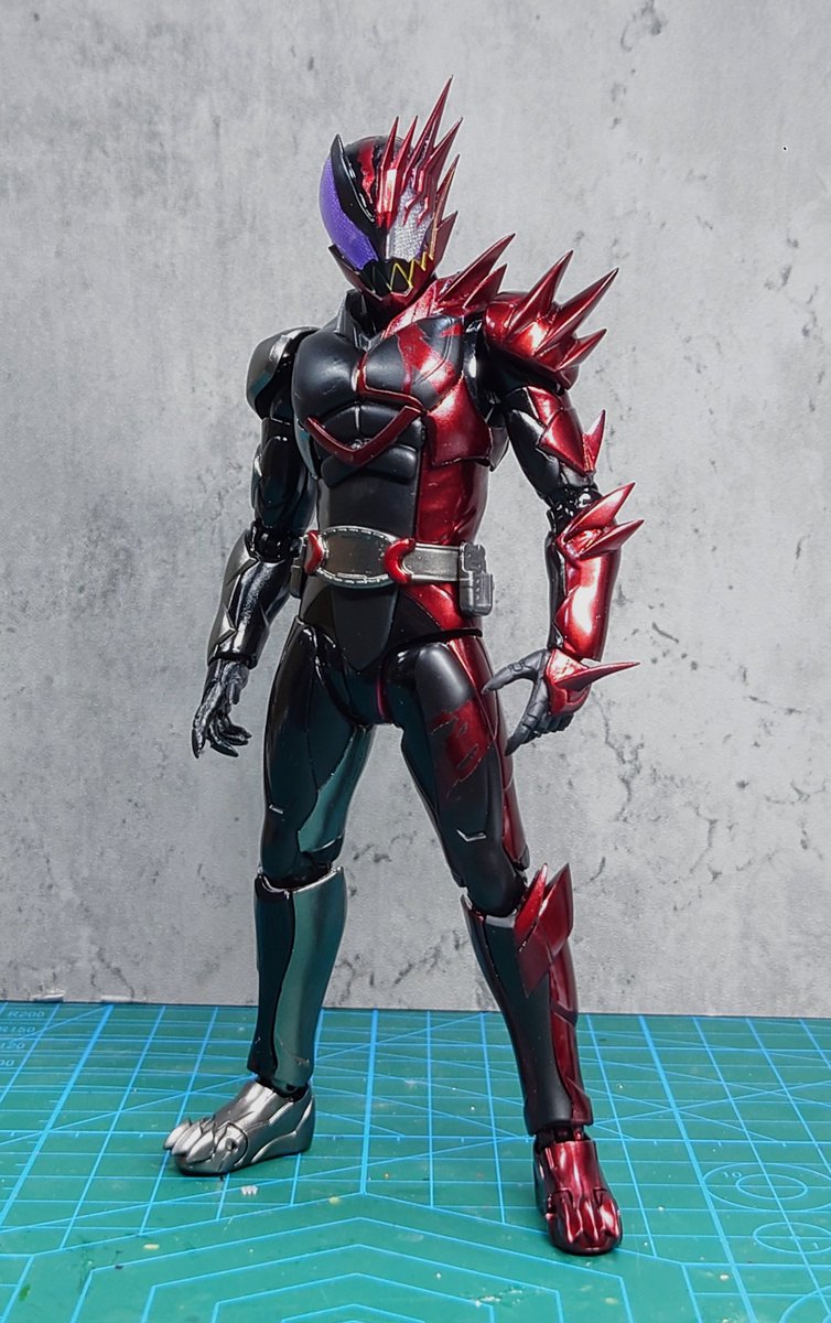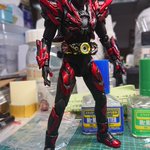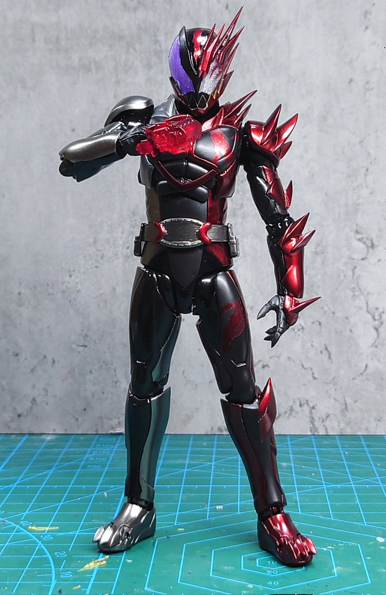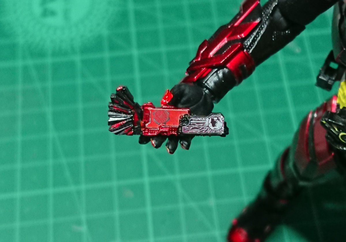 好みの色でクリムゾンベイルを改造しました! 劇中の色では、”クリムゾン”を冠するにはやや赤いが足りない気がするので、赤みを一気に増やしました。それとどうせ非対称なデザインになってるので、色合いもそれに合わせました。 #造って遊ぼ #ニチアサフィギュア改造部 #仮面ライダーリバイス