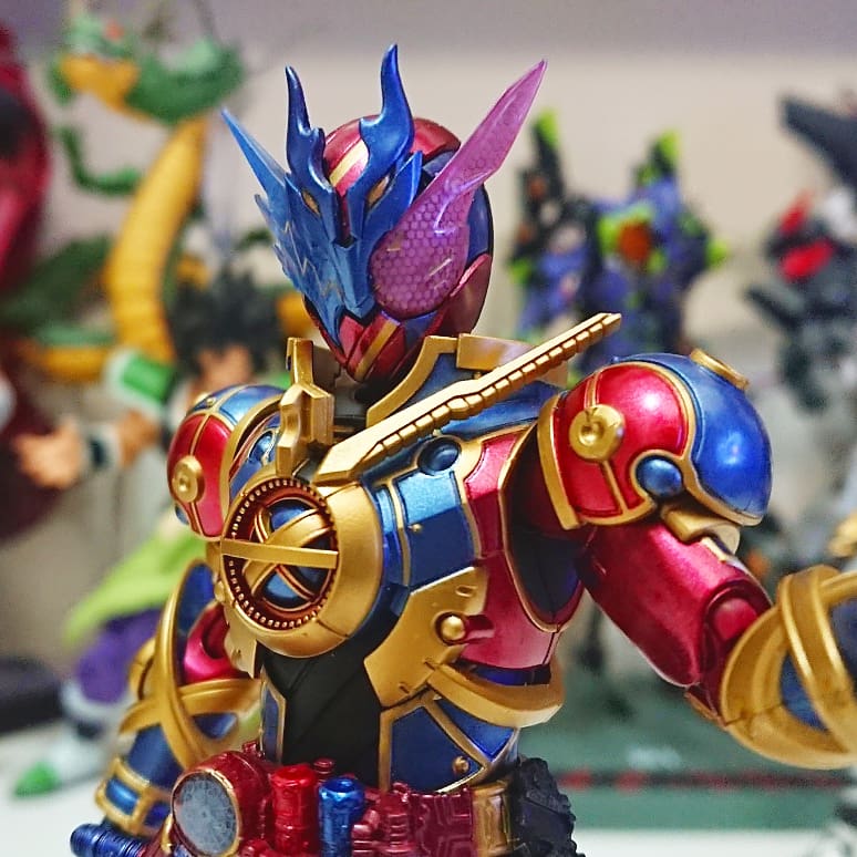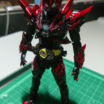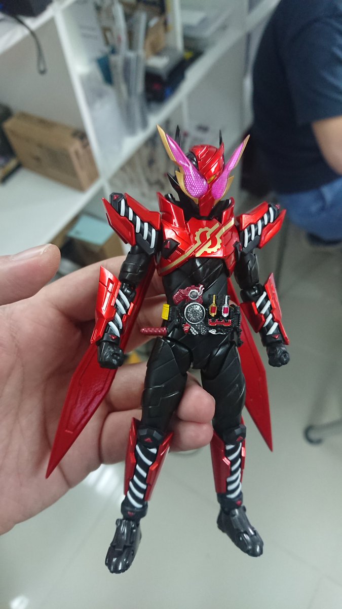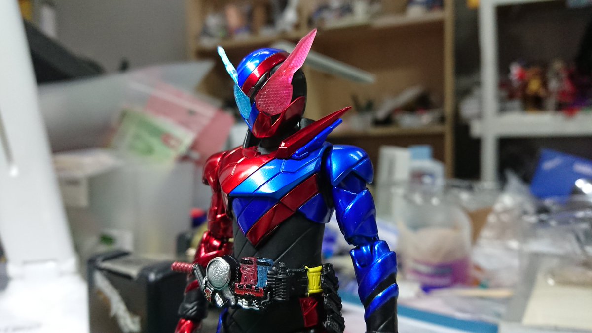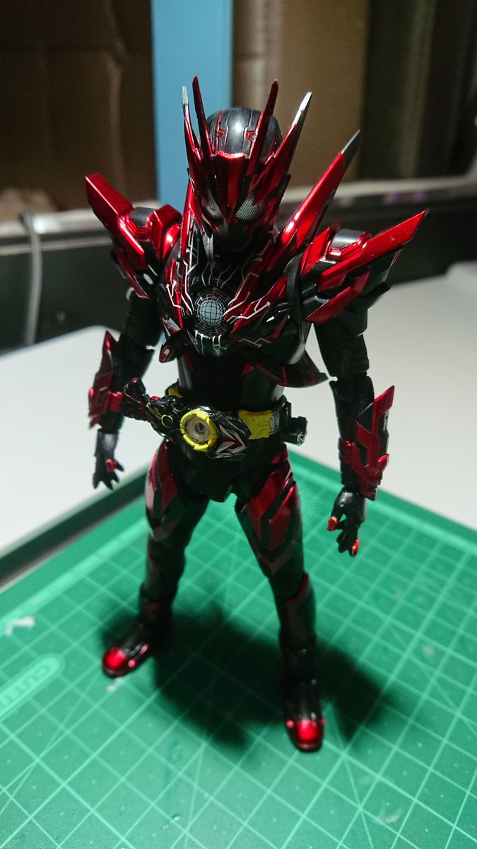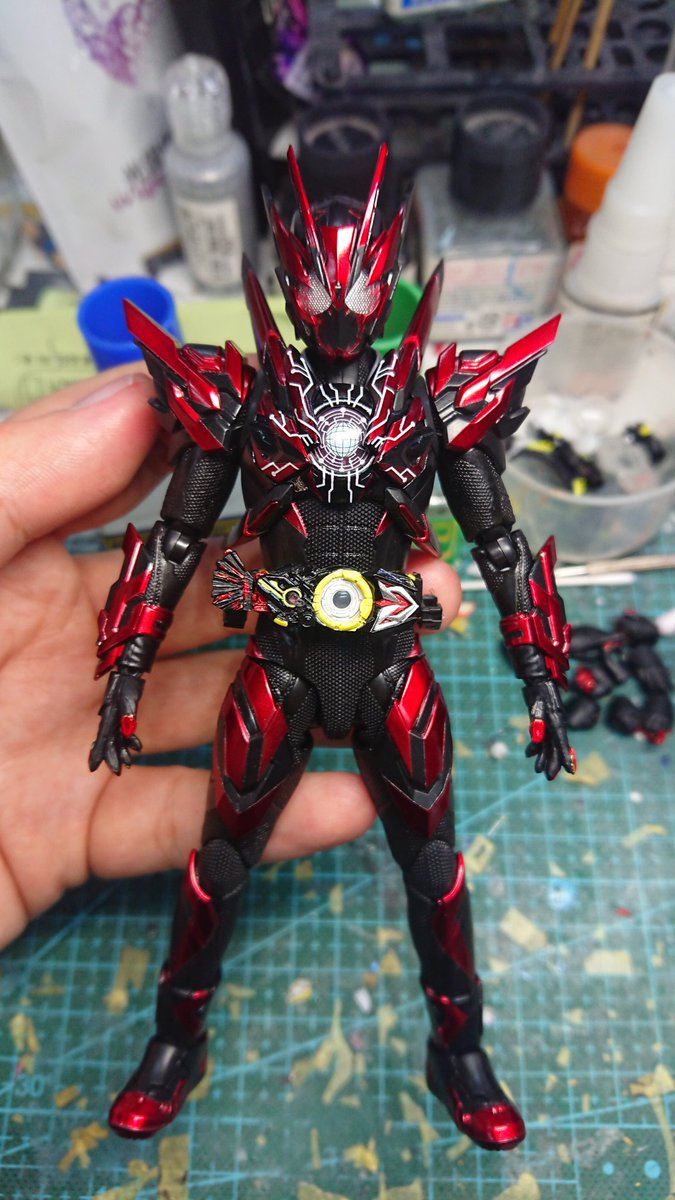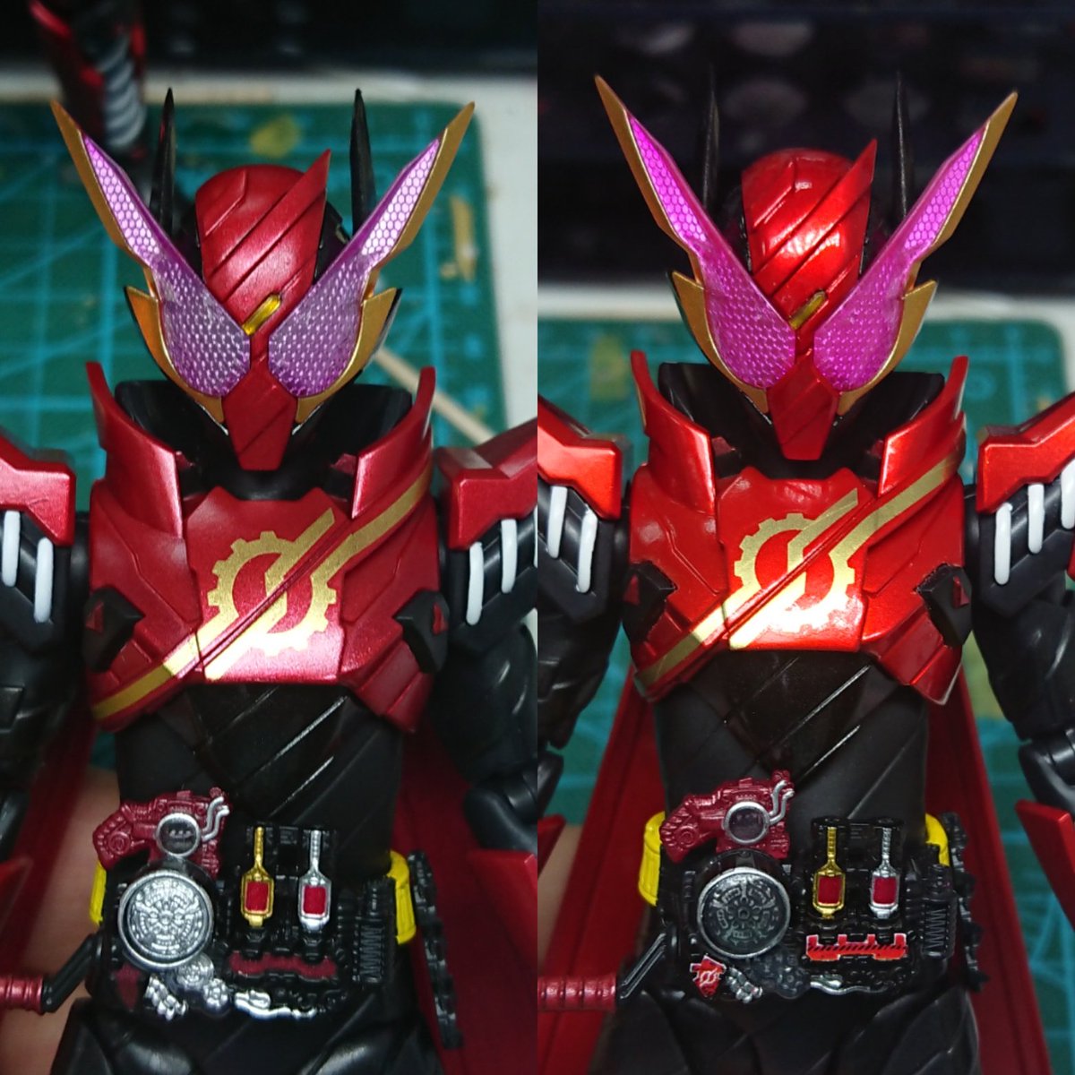 好みの色でクリムゾンベイルを改造しました! 劇中の色では、”クリムゾン”を冠するにはやや赤いが足りない気がするので、赤みを一気に増やしました。それとどうせ非対称なデザインになってるので、色合いもそれに合わせました。 #造って遊ぼ #ニチアサフィギュア改造部 #仮面ライダーリバイス