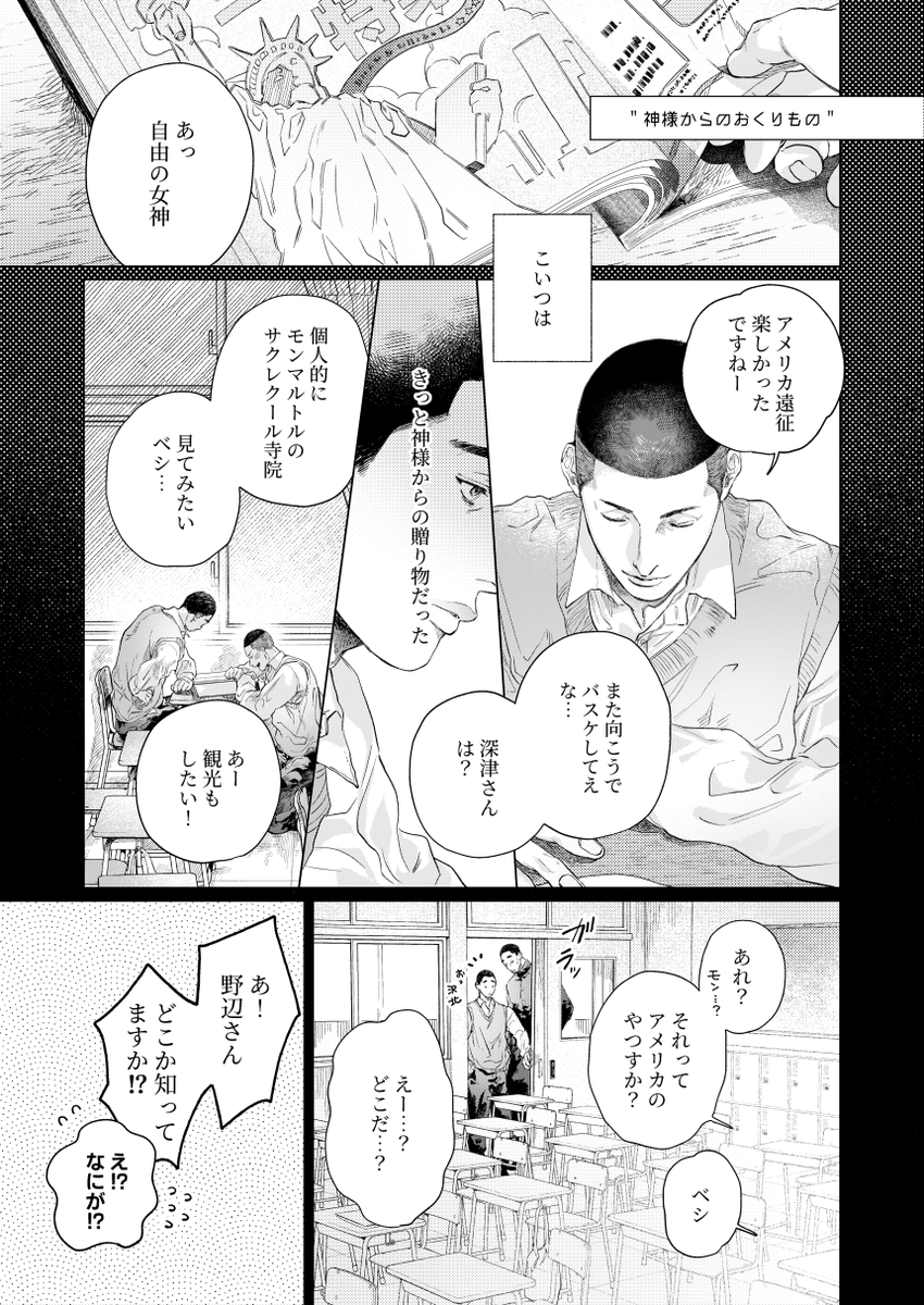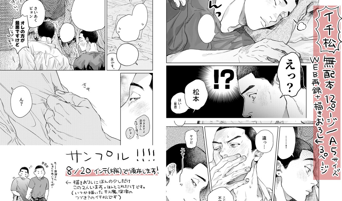 8/20のインテで頒布予定のイチ松無配本、描きおろし部分のサンプルです!他はツイッターに載せたものの再録(加筆修正)です…✊(12ページ/A5サイズ) またスペース番号が分かったり開催近くなった際に再度お知らせします~! 良かったらアンケ答えてください🥹→【forms.gle/ADYZ7fVHd7fUgW…】