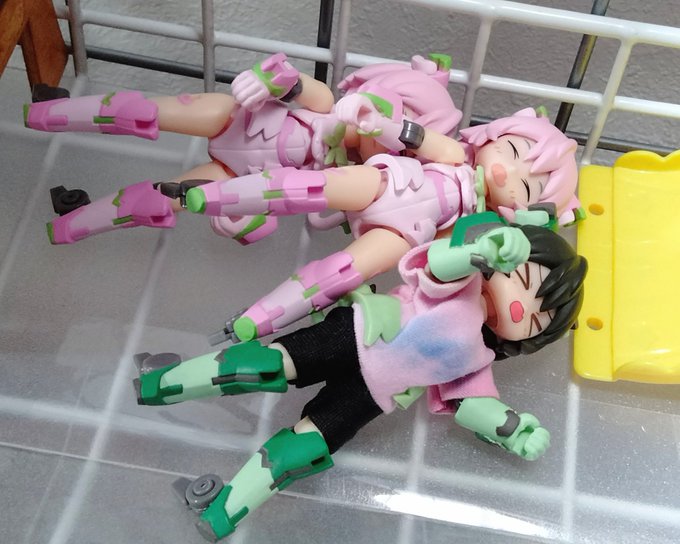 朝起きたらまとまってゴロ寝状態ww 恐らく模活机にぶつかった振動で転げ落ちたと思われますが、なんとも楽しげな様子にホッコリ☺️ そして、朝から轟雷達の見上げる視線を感じて可愛さ百倍!☺️ #デスクトップアーミー
