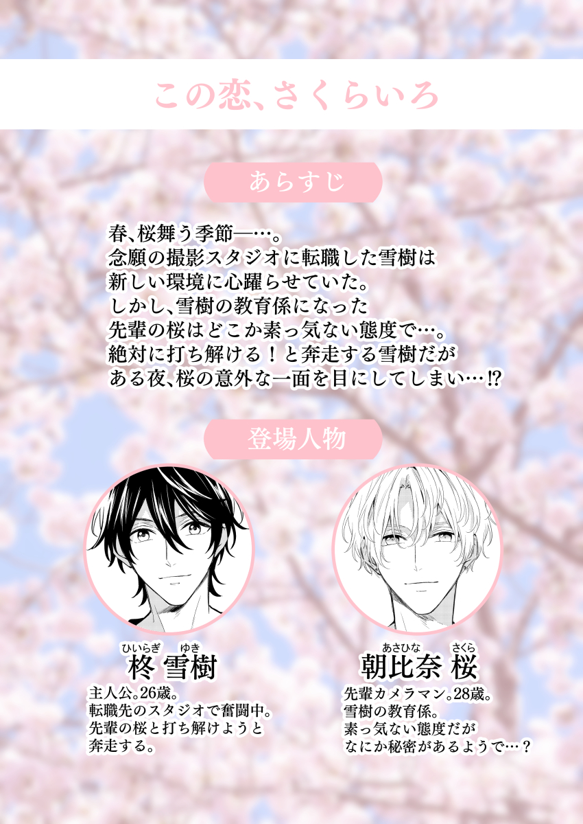 🌸配信情報🌸 『この恋、さくらいろ』 年下ポジティブ主人公×秘密あり?な先輩カメラマン シーモア cmoa.jp/title/251130/ Renta! renta.papy.co.jp/renta/sc/frm/i… Amazon amazon.co.jp/dp/B0BD899VMW/… その他書店でも配信中です よろしくお願いします #この恋さくらいろ #商業BL #創作BL