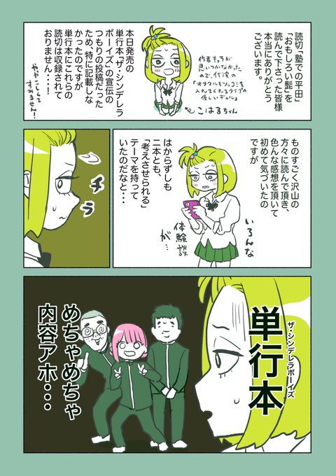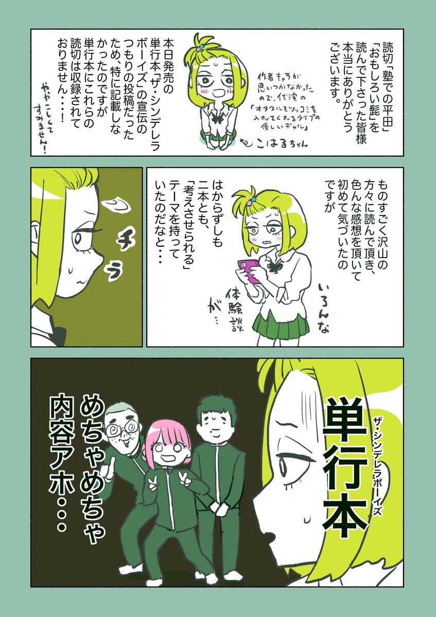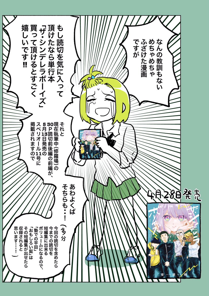 読切2本、たくさんの方に読んで頂き大変嬉しいです。 ありがとうございます! 単行本「ザ・シンデレラボーイズ」本日発売です!!! 読切とは関係ない一巻本連載をまとめたものですが、こちらも読んで頂けたら幸いです…!!