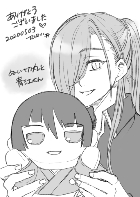 8 20 砂等さん(@sarasaya_go)からのリクエストでぬい切丸と大きい青江くん! #エアスケブ #エアコミケ 20/05/03 12:54