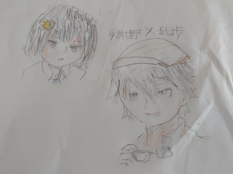 今度は文ストの乱歩と与謝野描きました! 声優スクールのYOUボイスで一緒の子と イラスト交換の約束して書きました!