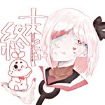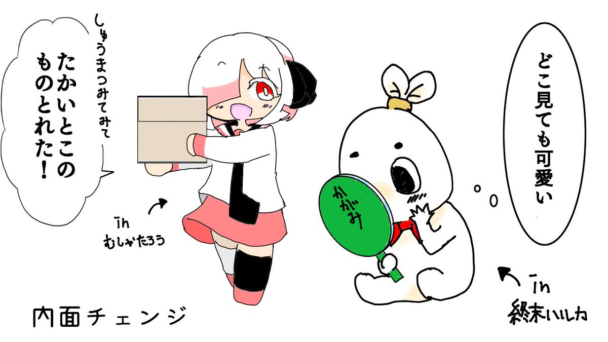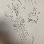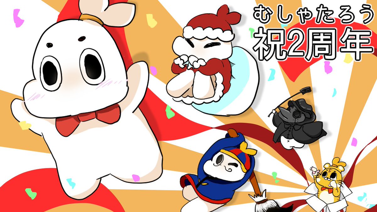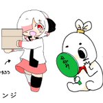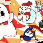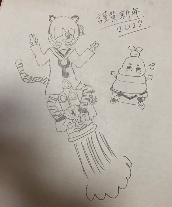 姉がお正月のむしゃとしゅうまつイラストを描いてくれました! タイトルは 「門松ロケットに乗って飛んでく終末と、鏡もちになったため置いてかれるむしゃちゃん」 だそうです ?🤔 #むしゃたろすけっち #終末ハル画