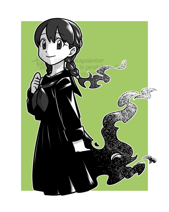 中1の頃描いたマンガキャラシリーズ 若葉ちゃん 学校の図書室に居着く幽霊👻温厚だけどキレたら伸縮自在のおさげで攻撃するぞ! 図書室が亡くなった場所なのか・死因は何か、は当時全く考えていません う〜ん厨二(*^ω^*) #イラスト #illustration