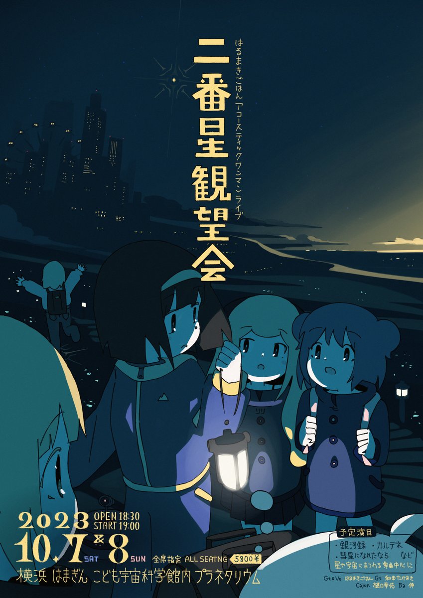 プラネタリウムでアコースティックLIVEをします 「二番星観望会」 2023年10月7日(土)/ 8日(日) 開場18:30 / 開演 19:00 at 横浜 はまぎん こども宇宙科学館内プラネタリウム ■OFFICIAL HP先行 抽選受付期間:2023年8月11日(金)20:00~2023年8月25日(金)23:59 l-tike.com/harumakigohan/