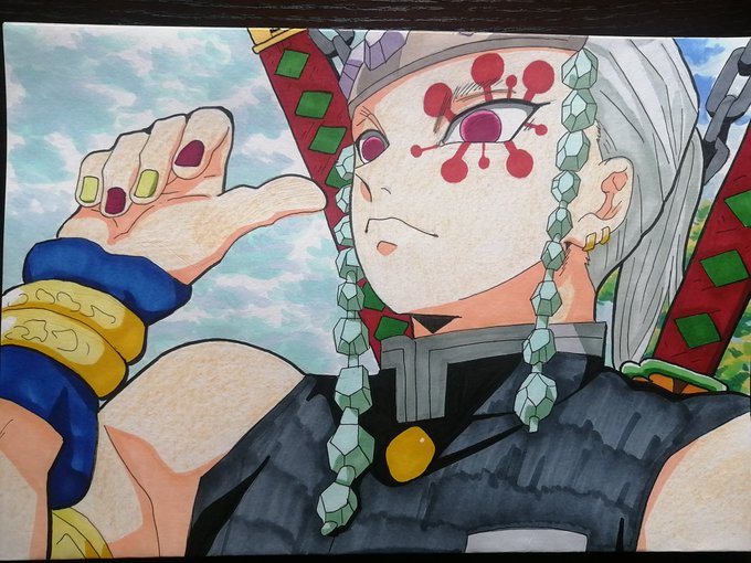 隊服にムラが…でもハデハデにかっこよく描けました。 #鬼滅の刃イラスト #宇髄天元 #模写 #コピック #色鉛筆