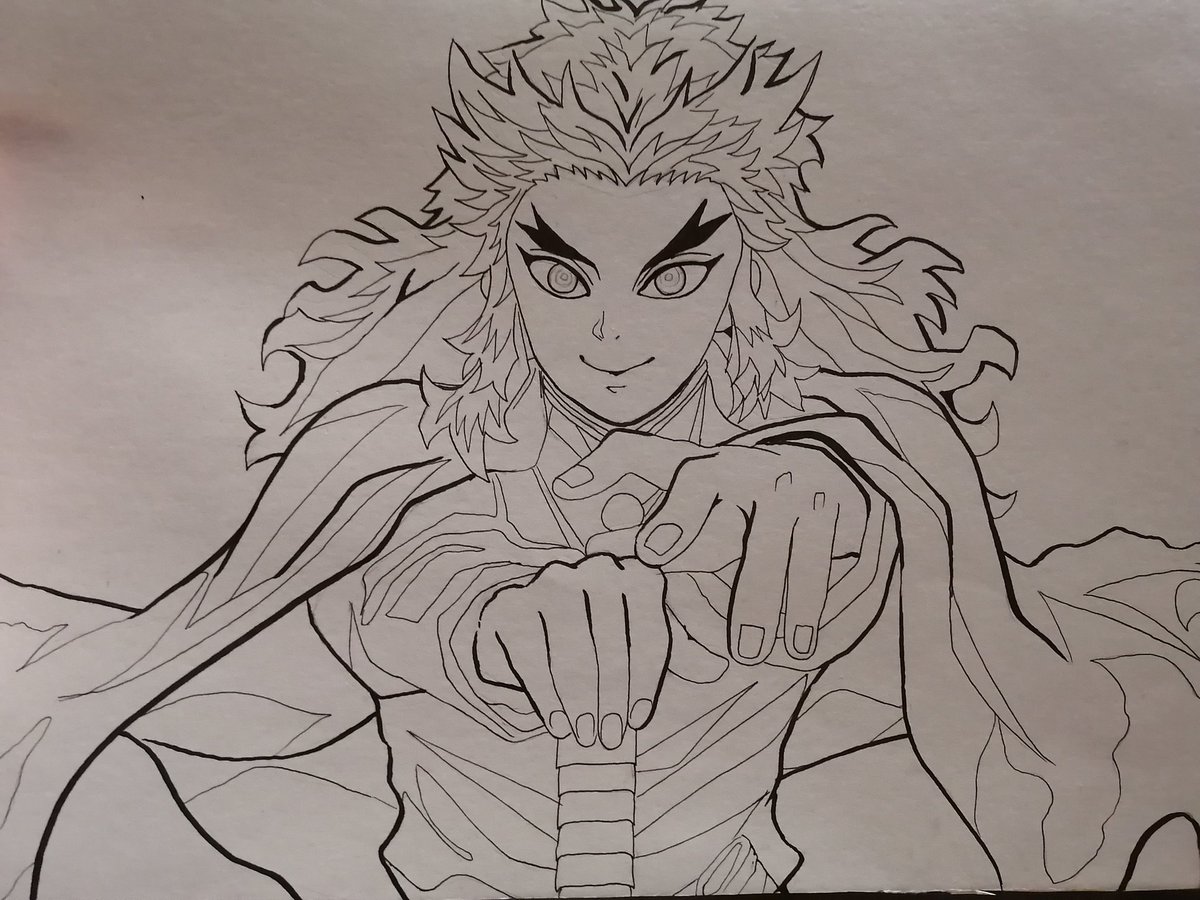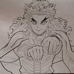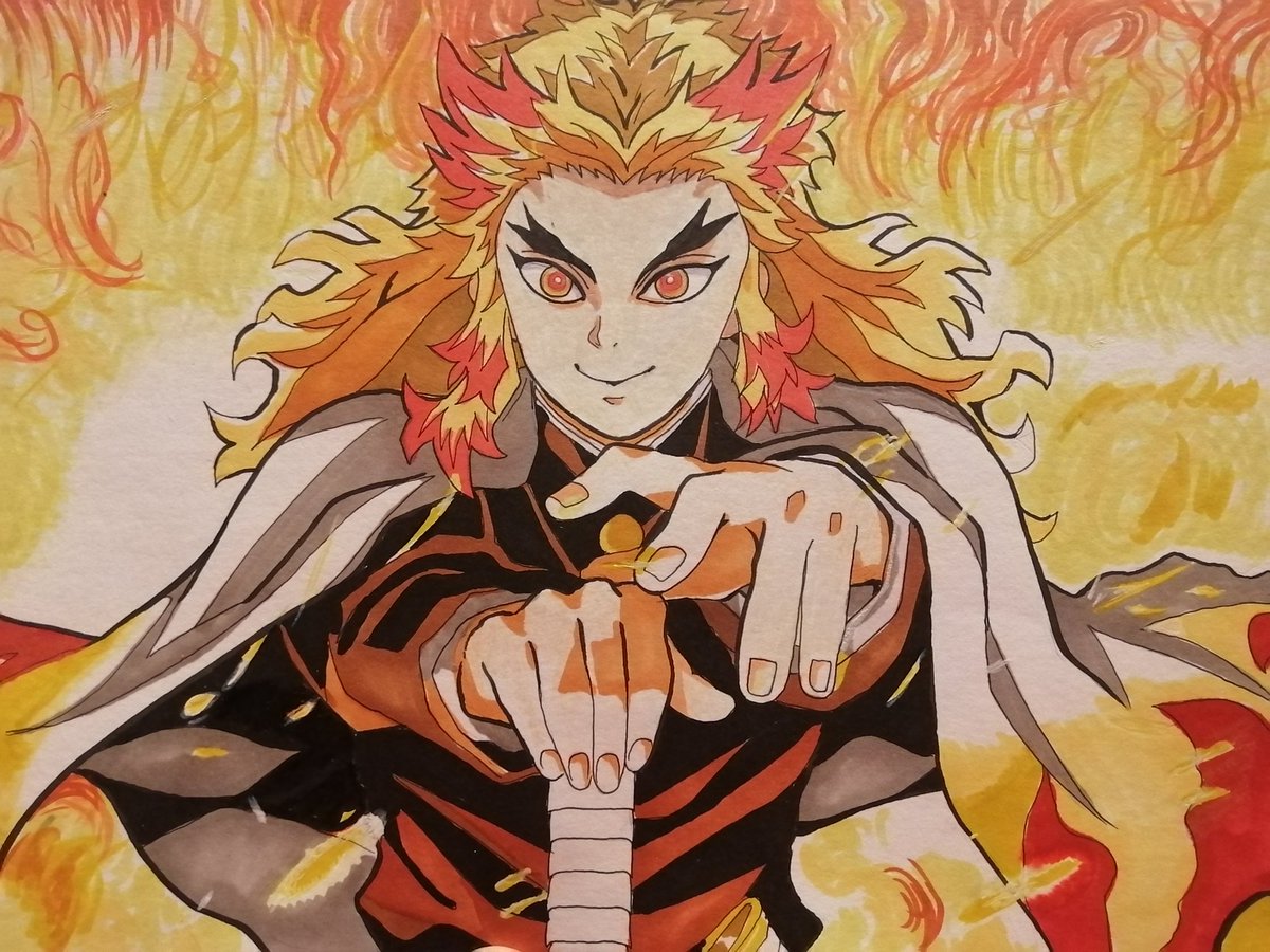 煉獄描きました!さすが炎柱、燃えてるような感じで描けました。でも背景はアナログでは難しい。。 #鬼滅の刃イラスト #煉獄杏寿郎 #模写