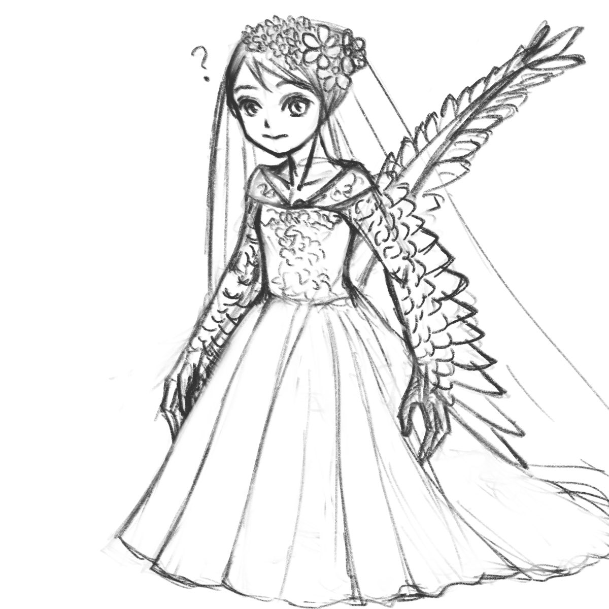 3RTで性癖絵落書き。 ゼクシィ+人外ってことでゼクシィキュル子。 最初はハーピィが足隠しちゃうと意味ないだろと足出しだったんですが…どうしてもガッツリ鱗や爪が生えてる足とドレスがミスマッチだったんで。足隠しました。 🐓<うごきにくいキュッピキュ…