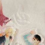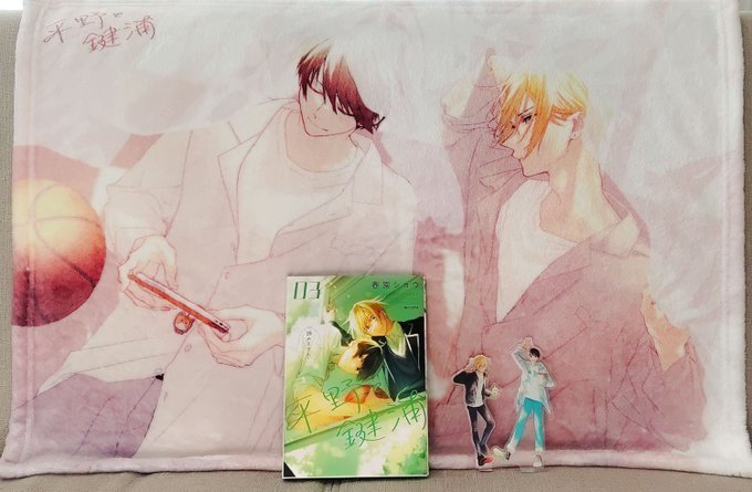 2/27発売 平野と鍵浦4巻 とらのあな限定版のミニブランケット news.toranoana.jp/228231 サイズと質感の感じ…短めでさらさらしてて手触り良し、夜中に膝にかけて作業してたけどあったかくて良いです。 ~サイズ参考に、3巻と2019年にくじコレで作ってもらったグッズを添えて~