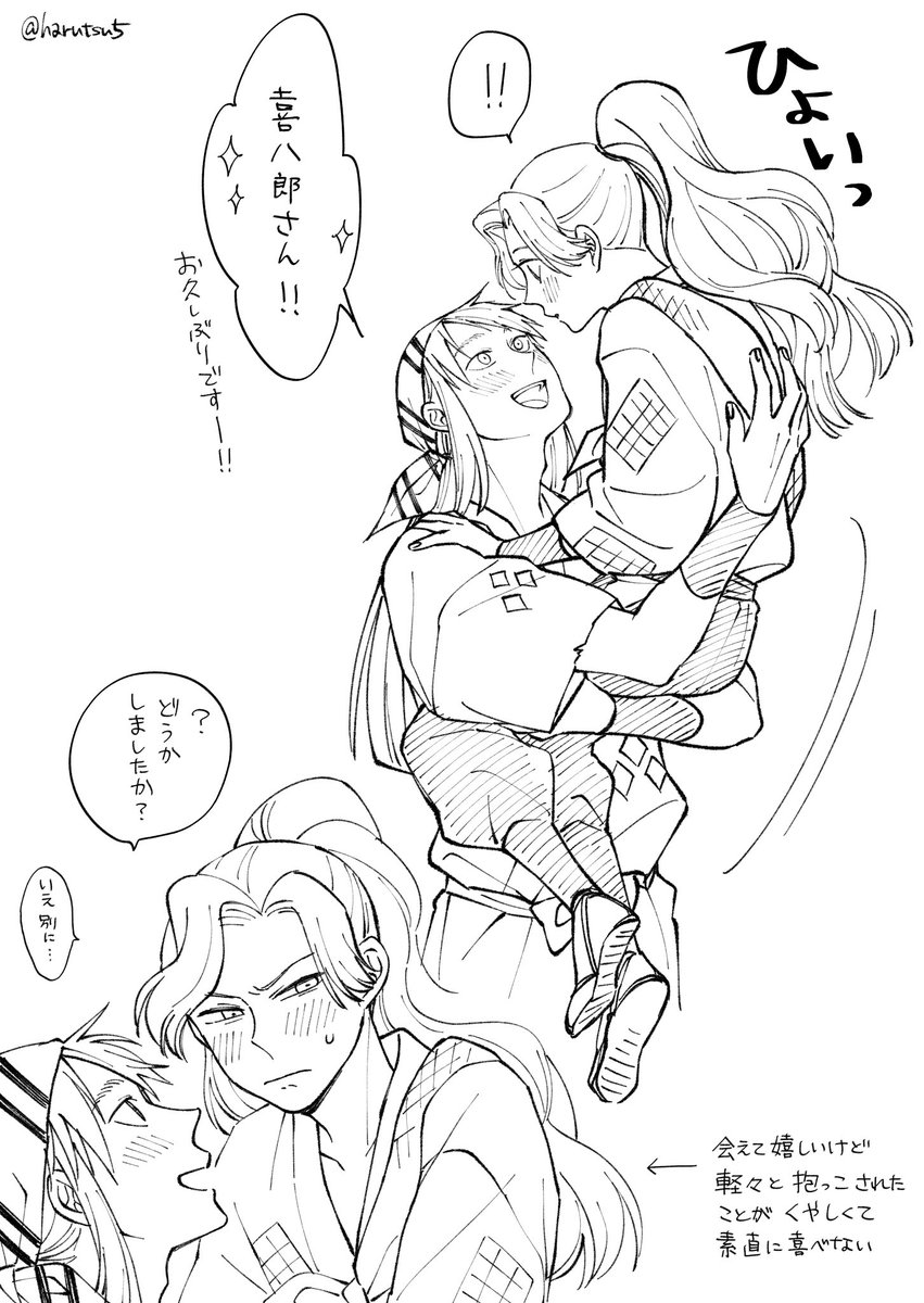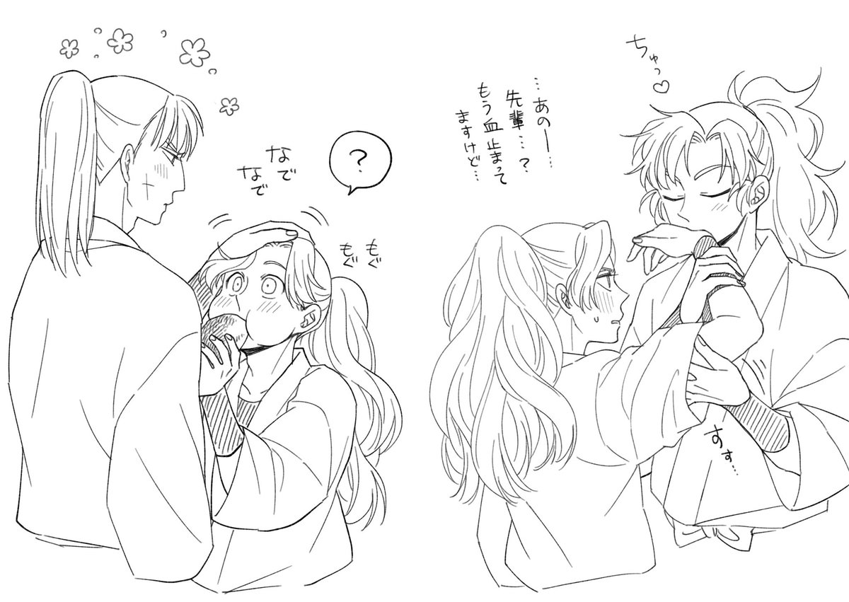 あまりにも見たいから自分で描いた義×作法 鯨肉バーベキューの時にこういうことがあったとしてもおかしくない twitter.com/harutsu5/statu…