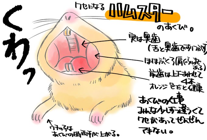 先日ハムスターのあくびの画像のあるツィートした人に「気持ち悪い」とレスした人がいんだけど。 思うのは勝手だけどわざわざ嫌がらせのようにレスしてくんじゃねーよと思った訳で… でもハムの者にとってはあくびはめちゃ魅力的なものだと言いたくて図説してみた。 #ハムスター #ハムスター絵