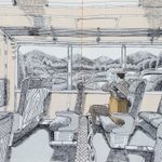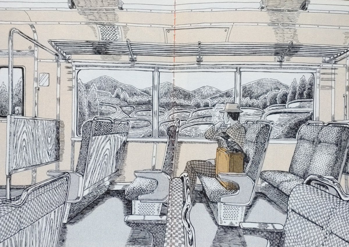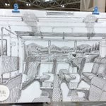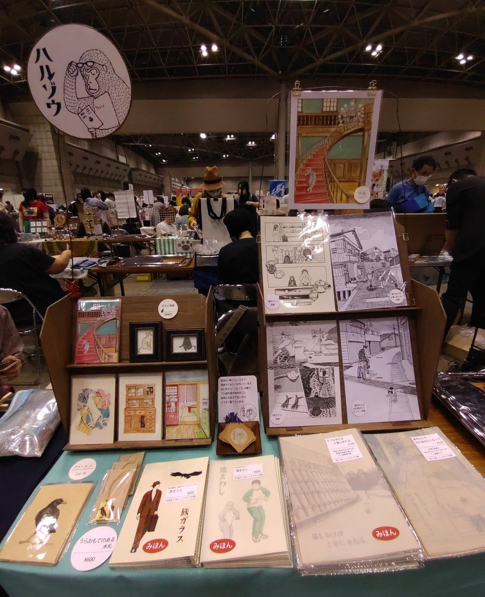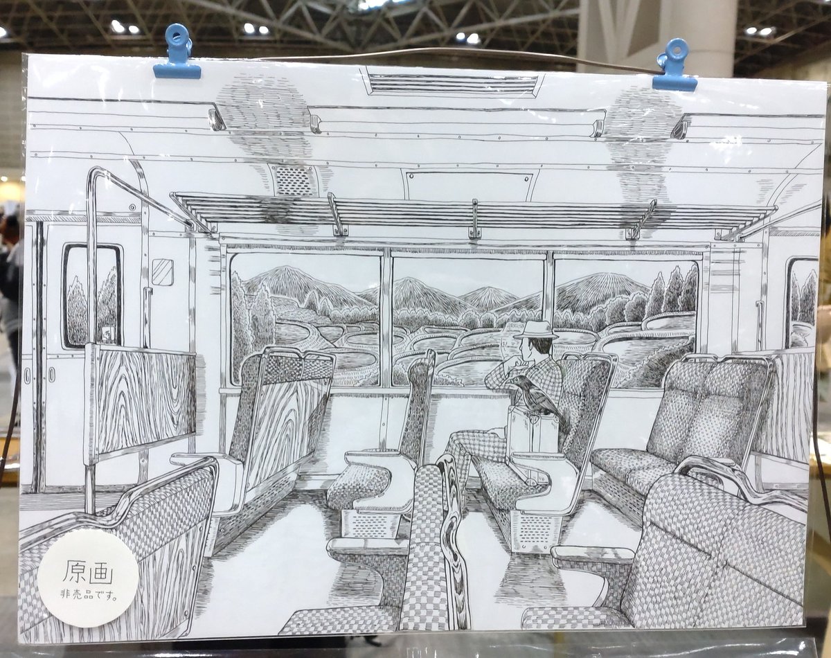 新刊「旅ガラス」の見開きページ 原画(左)も展示してます✨ 使用ペンはユニボールシグノ0.28 色版はデジタルで今回は二色刷り。 現場から中継でお伝えしました~🎤 #エアコミティア139 #COMITIA139