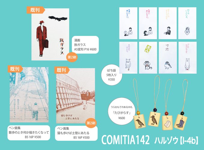 あらあら… 今週の日曜はもう #COMITIA142 ですね。 新刊はこれっぽっちも間にあわなかったので お品書きはこんな感じです。 時節柄、ぽち袋など持って行こうかと。 既刊は増刷したのでどっさりありますぜ👍 よろしくお願いしまーす🎵
