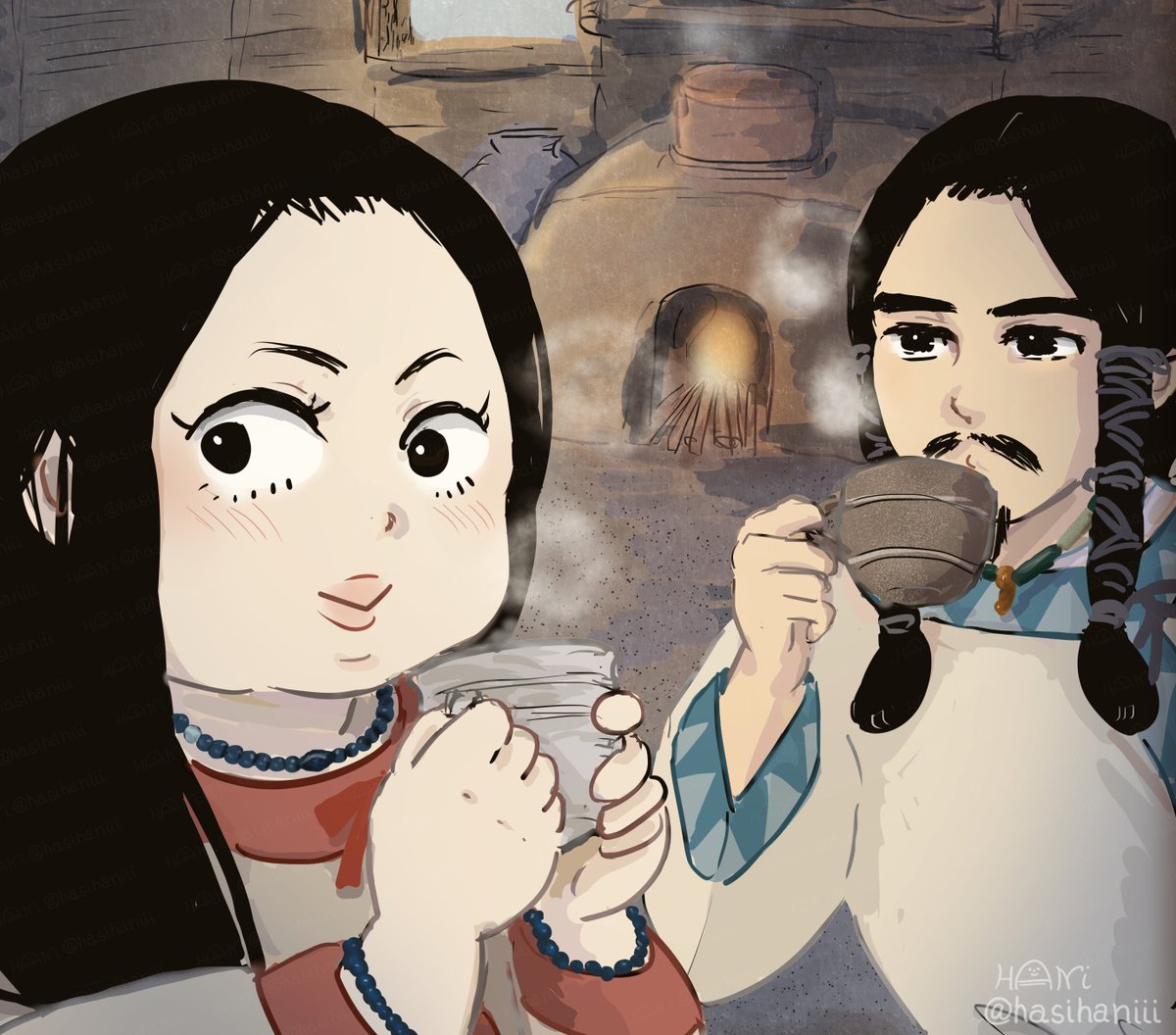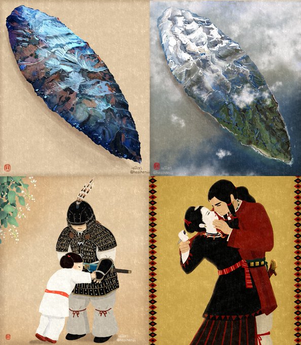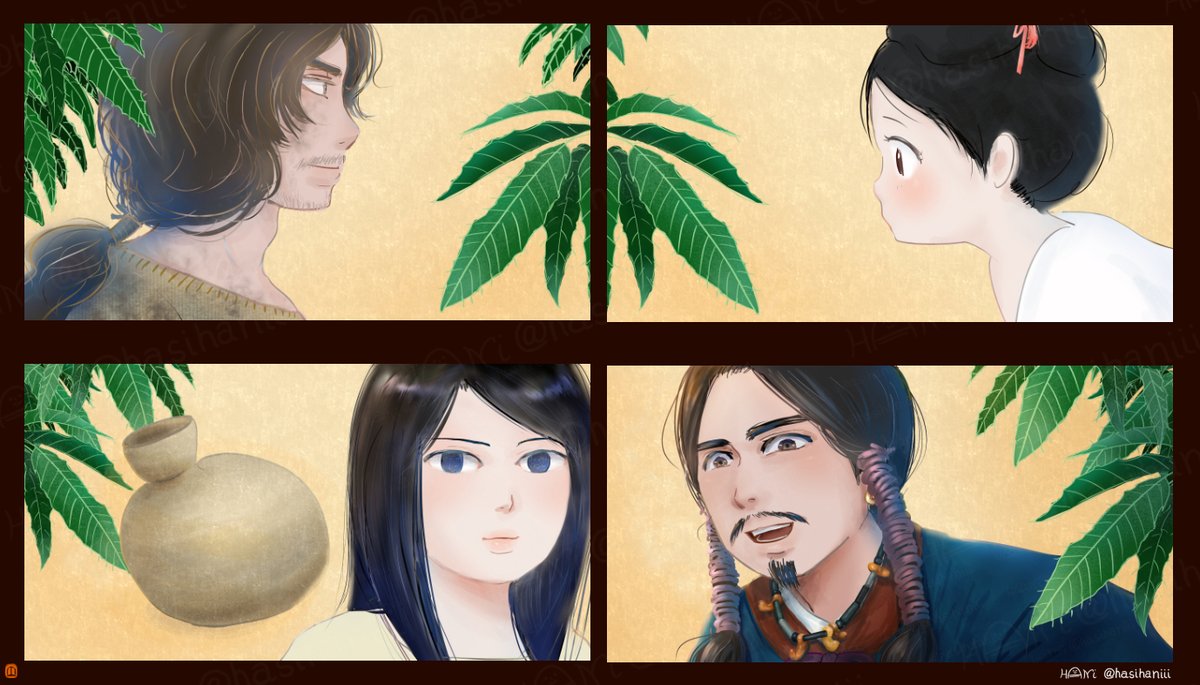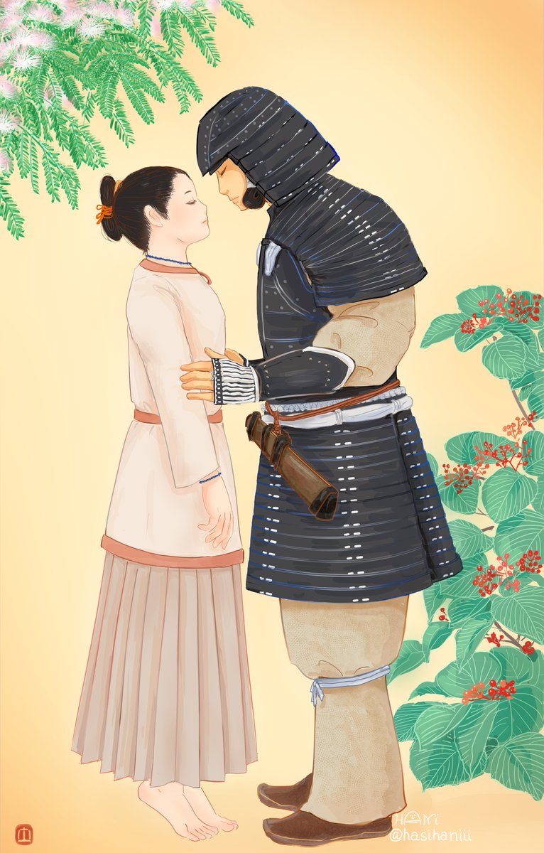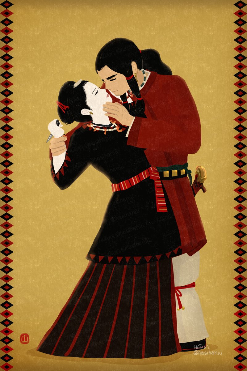 なかなか自創作の漫画進まないのでイメージ画描きました 美貌の兄媛(えひめ)に妻問い(求婚)しに来たやんごとなき身分の大首長・風日(かざひ)さま。二人は同い年。前ツイ画甘い雰囲気に見えますが全くおだやかな状況ではありません。妹の弟媛(おとひめ)の初々しい恋とはまた違った恋を描く予定 twitter.com/hasihaniii/sta…