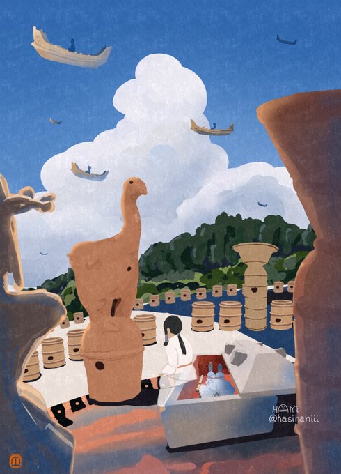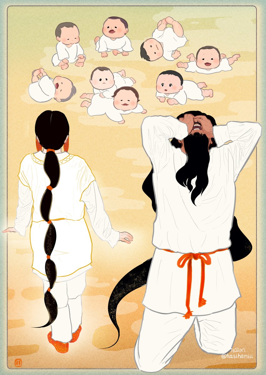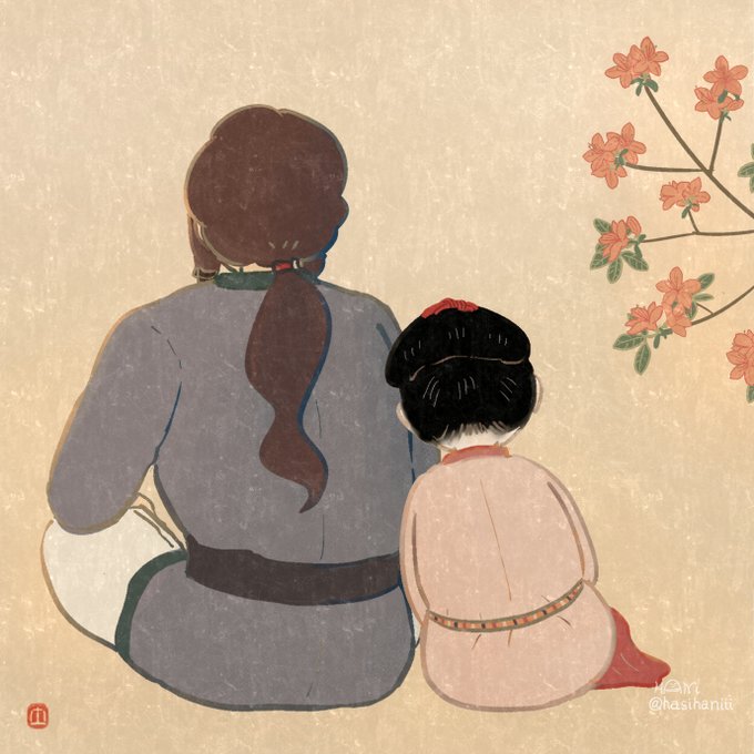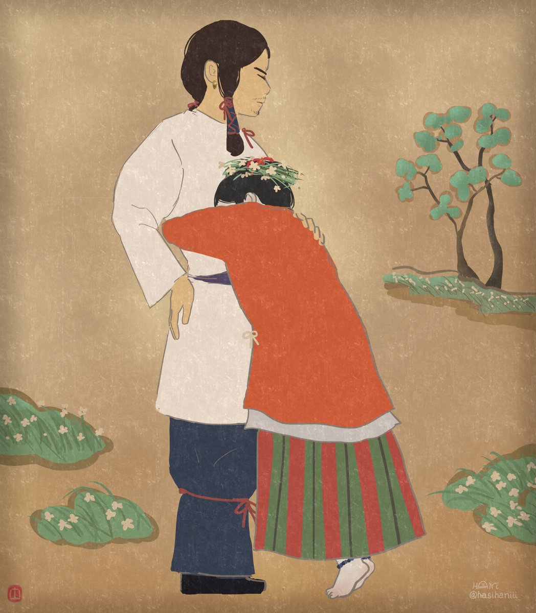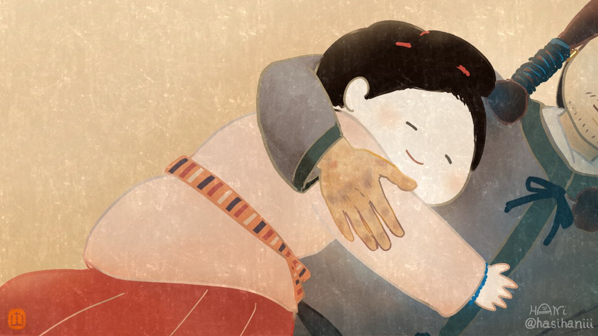 なかなか自創作の漫画進まないのでイメージ画描きました 美貌の兄媛(えひめ)に妻問い(求婚)しに来たやんごとなき身分の大首長・風日(かざひ)さま。二人は同い年。前ツイ画甘い雰囲気に見えますが全くおだやかな状況ではありません。妹の弟媛(おとひめ)の初々しい恋とはまた違った恋を描く予定 twitter.com/hasihaniii/sta…
