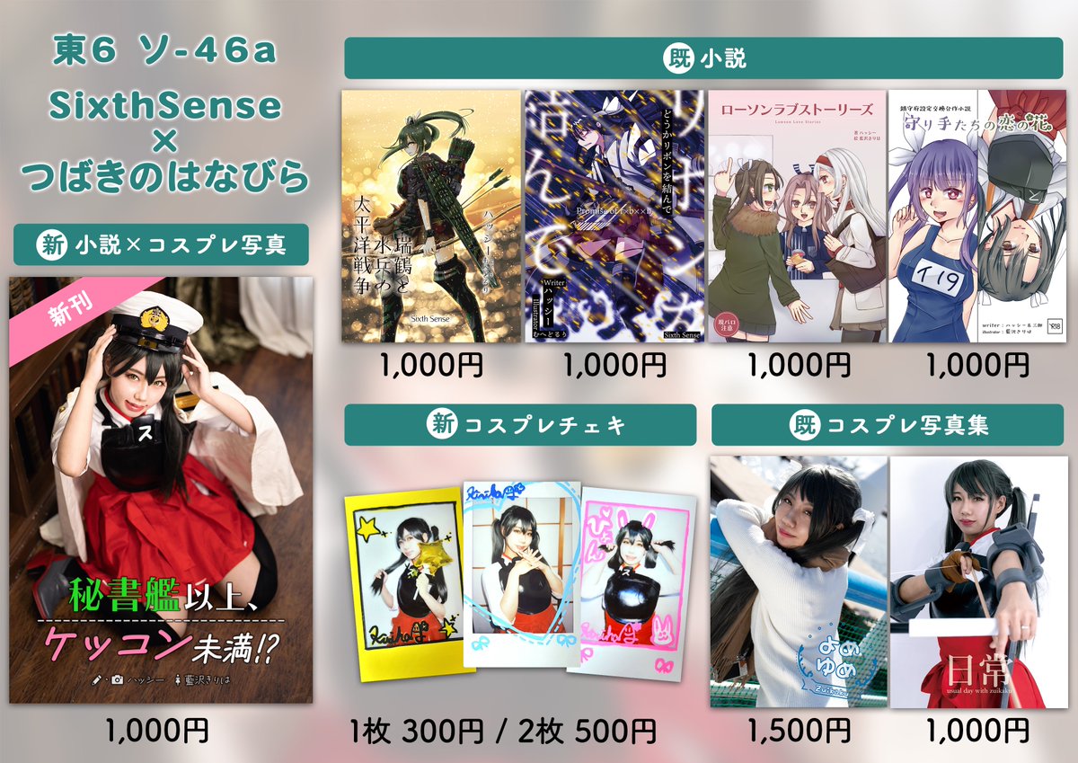 【#C100 告知】 夏コミ2日目 東6 ソ-46a「SixthSense×つばきのはなびら」当日のお品書きです。新作は"挿写"を使った瑞鶴純愛小説本『秘書艦以上、ケッコン未満!?』&きりはさん瑞鶴のコスプレチェキです。チェキは会場限定で枚数も少ないのでお早めに! 新刊メロン通販: melonbooks.co.jp/detail/detail.…
