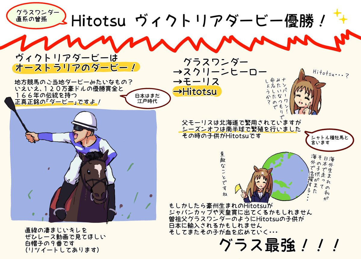 グラスワンダー直系の曾孫Hitotsuがオーストラリアのダービーを制覇! この快挙を多くの方に知って頂きたいです #グラスワンダー #モーリス #Hitotsu