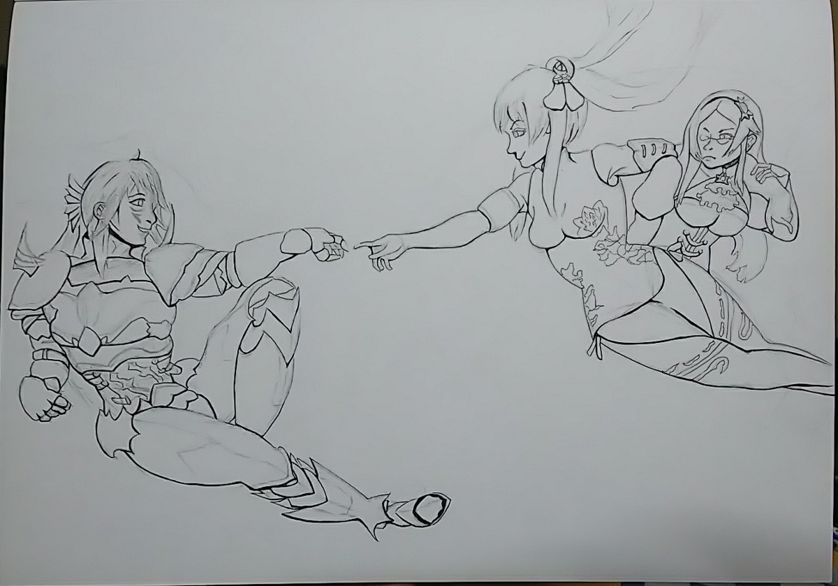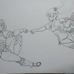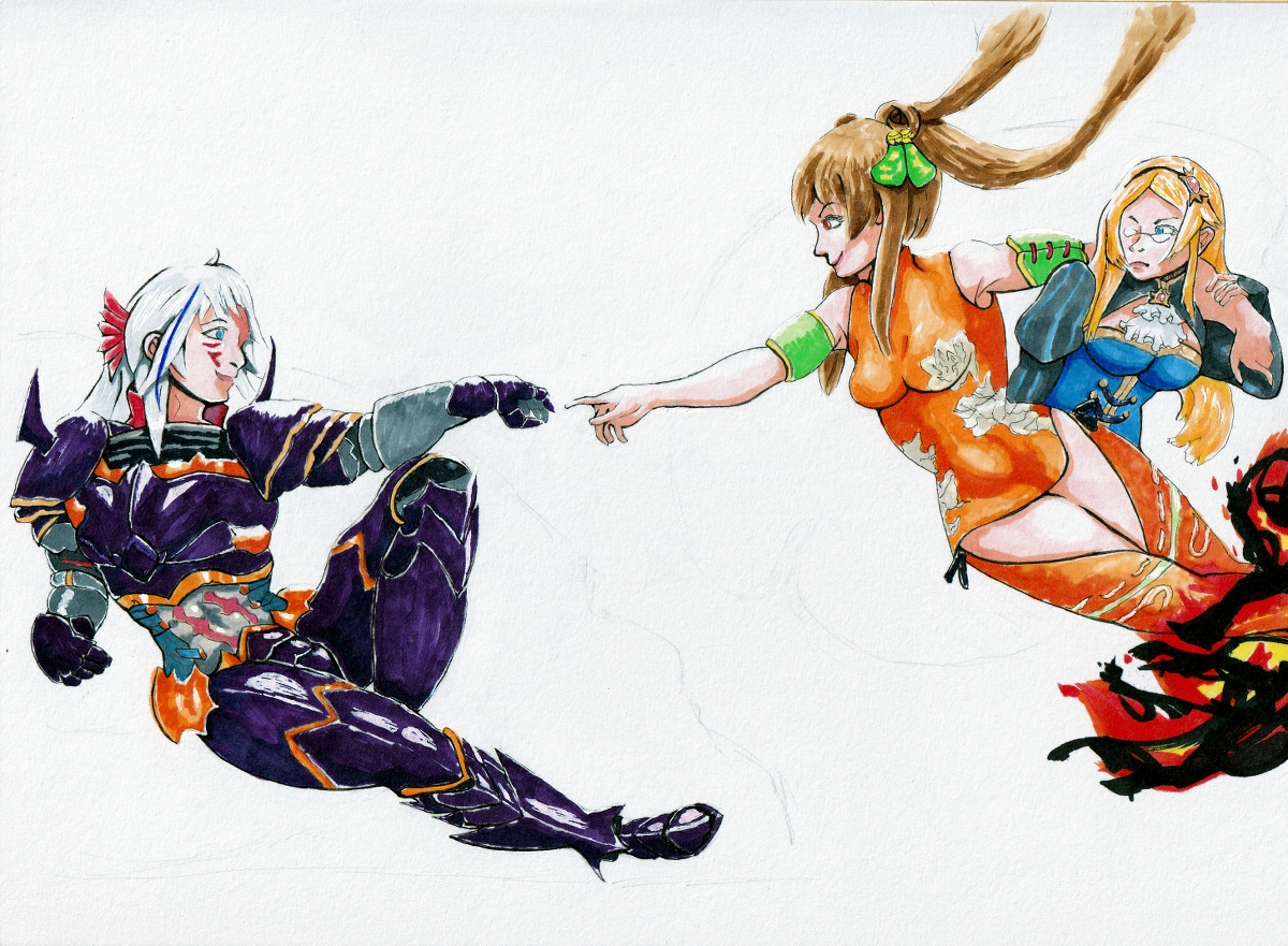 2 14 天女降臨 #千年戦争アイギス #アナログ #コピック #絵画 #紅輪の道士ナタク #深淵を知る者アトナテス #戦術教官ケイティ pixiv.net/artworks/99254… 22/06/23 23:50