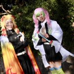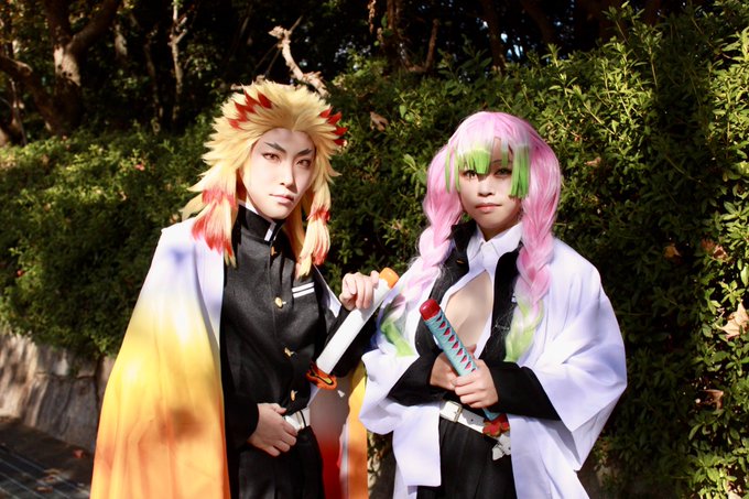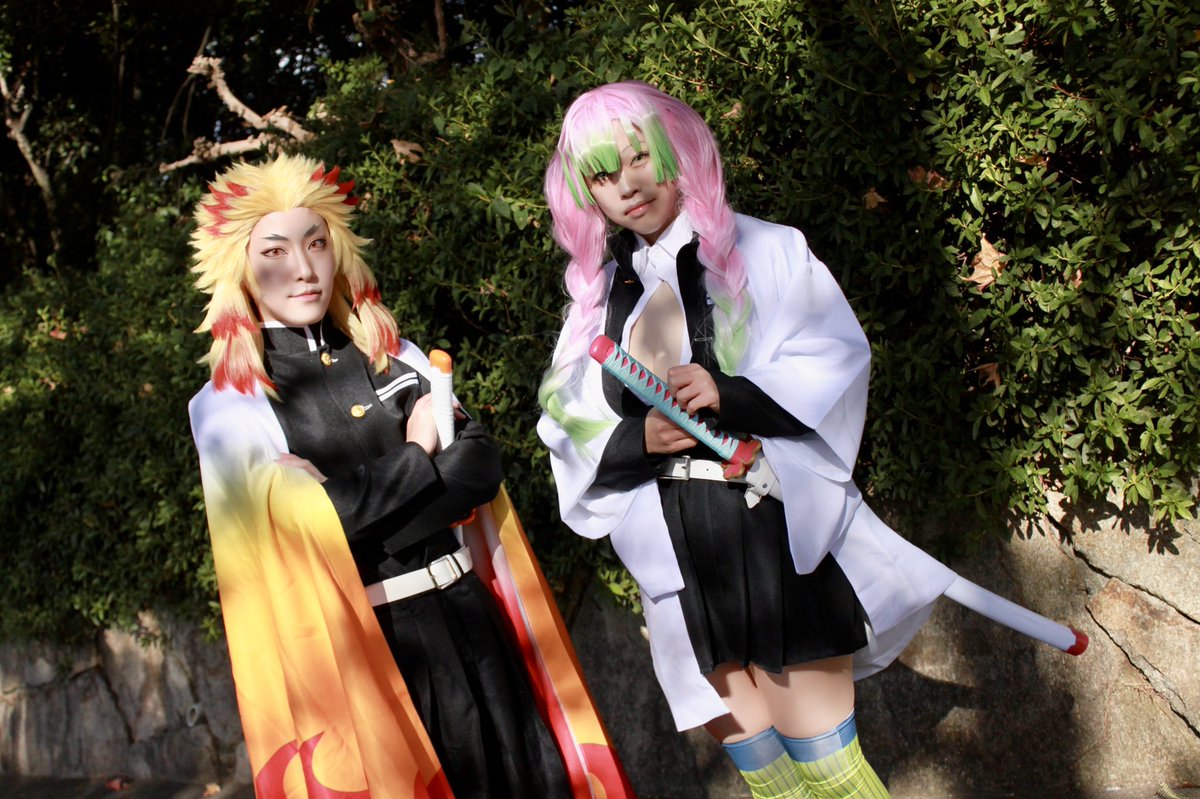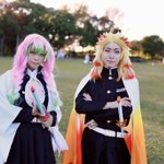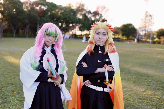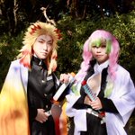 [Cosplay]鬼滅の刃 鬼殺隊最高位 '' 柱 '' - - - - - - - - - - - - - - - - - - - - - - - - - - 煉獄杏寿郎:はちみつ 甘露寺蜜璃:@cos__61 photo:@asikke wig:@kushi_fuwat #アコスタ寝屋川公園