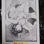 夜なべして描いたが、朝方に消しゴムかけでズッ、てなったのでディスプレイ兼売り子様のバイト代になったチビ色紙。