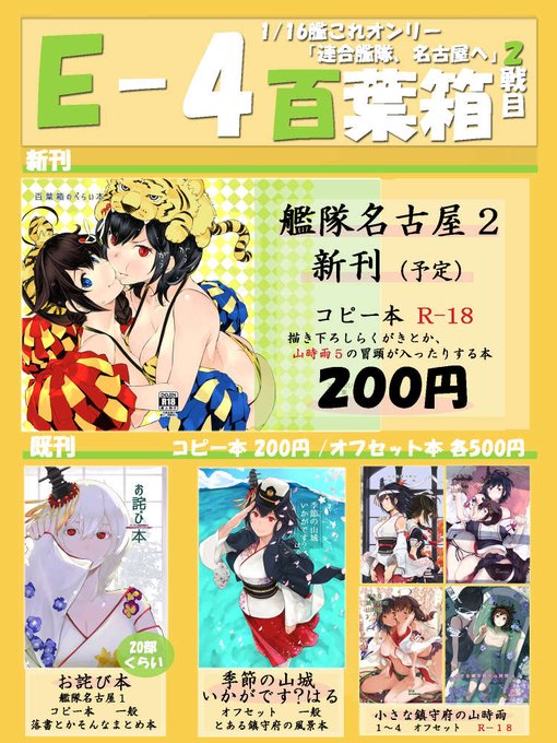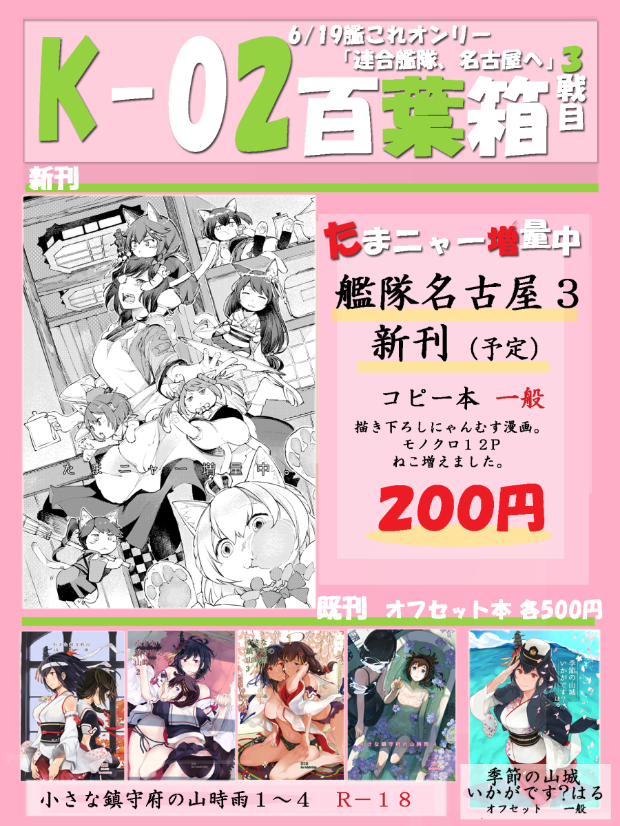 色々ミスってるので再掲すみませぬ。 明日の艦隊名古屋4に向けてのお品書きです。コピ本無理でしたので既刊と久しぶりの詫びペーパーがありますハイ。 #艦隊名古屋