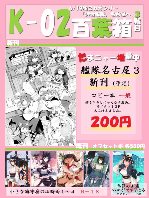 39 57 色々ミスってるので再掲すみませぬ。 明日の艦隊名古屋4に向けてのお品書きです。コピ本無理でしたので既刊と久しぶりの詫びペーパーがありますハイ。 #艦隊名古屋 23/02/18 18:12