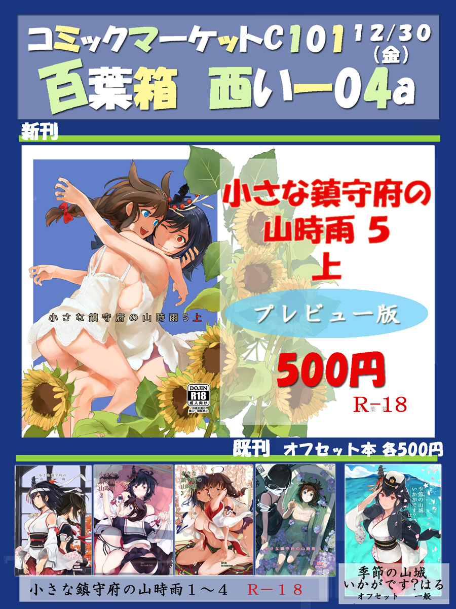 百葉箱のC101お品書きです。新刊の『小さな鎮守府の山時雨5上』は山時雨5のプレビュー版です。イベント会場のみの頒布となりますのでよろしくよろしく。