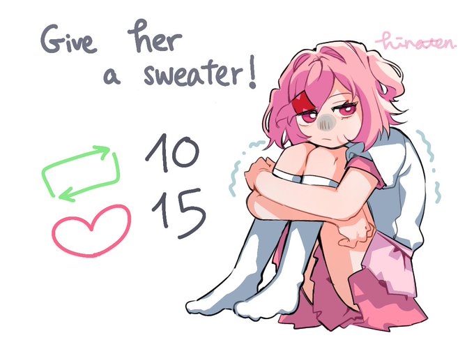 222 708 Ok she got the sweater now but... Next challenge make her warmer😈 #ddlc twitter.com/hatocko/status… 22/12/09 03:07