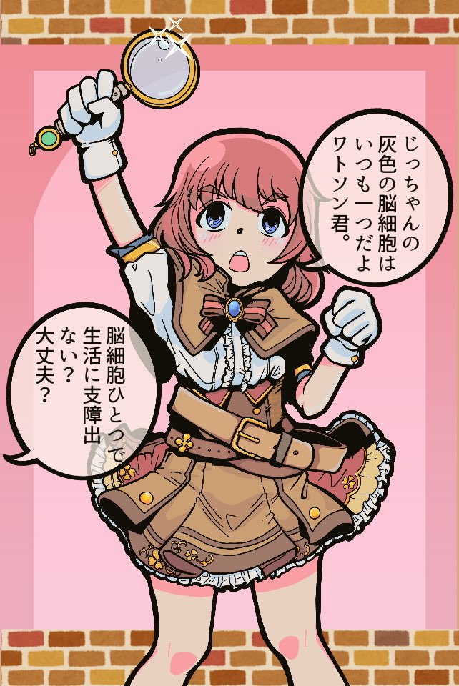 探偵のキメセリフを模索中、色々パクりまくって迷走中の安斎都ちゃん。 池袋晶葉ちゃんとユニット組んで欲しい脳内ランキング上位常連なのに運営には届きませんね…探偵と発明家のドタバタミステリー、シンデレラ世界線で深夜ドラマやってて欲しい。