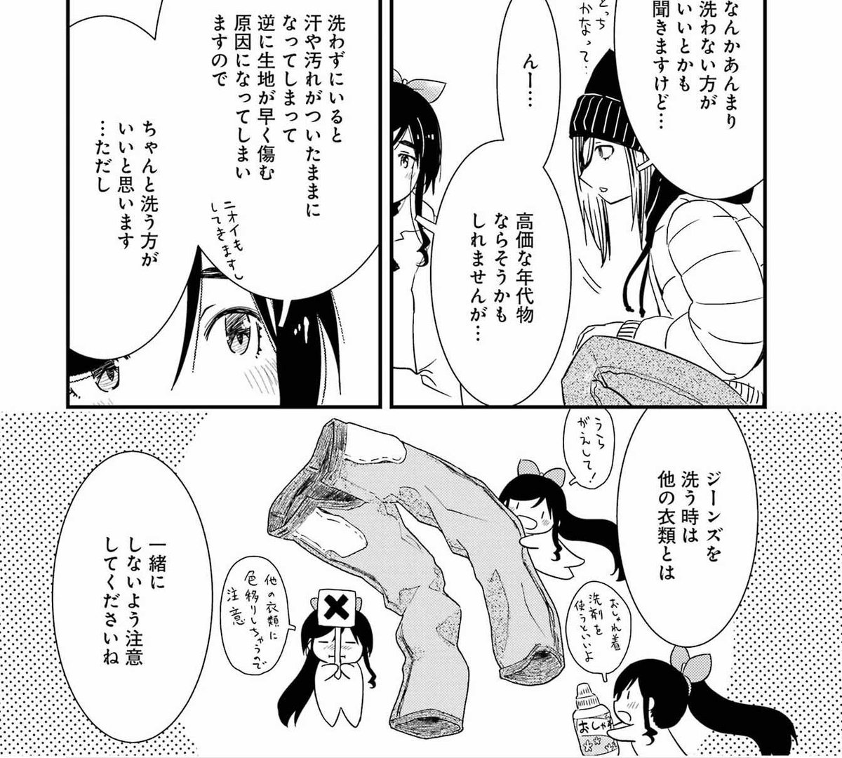 ヤングガンガン発売中です。「綺麗にしてもらえますか。」67話載っています。 金目さんはとあることを確かめるために泊りがけで遠出します。その先でジーンズの洗い方を人に教えたりしつつ、少しずつ金目さん自身の記憶を辿っていき……というお話です。
