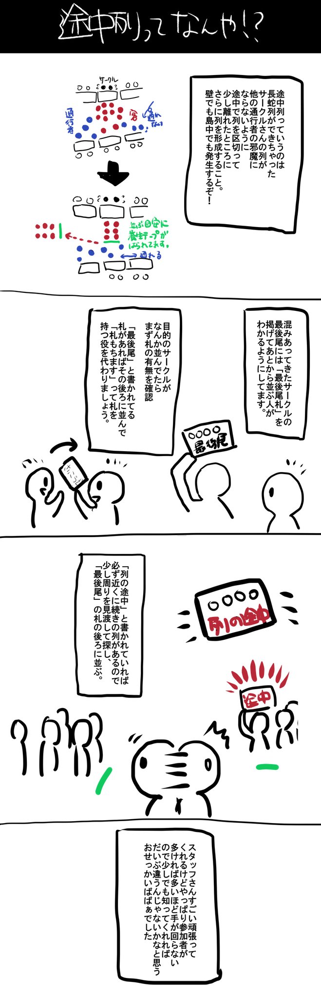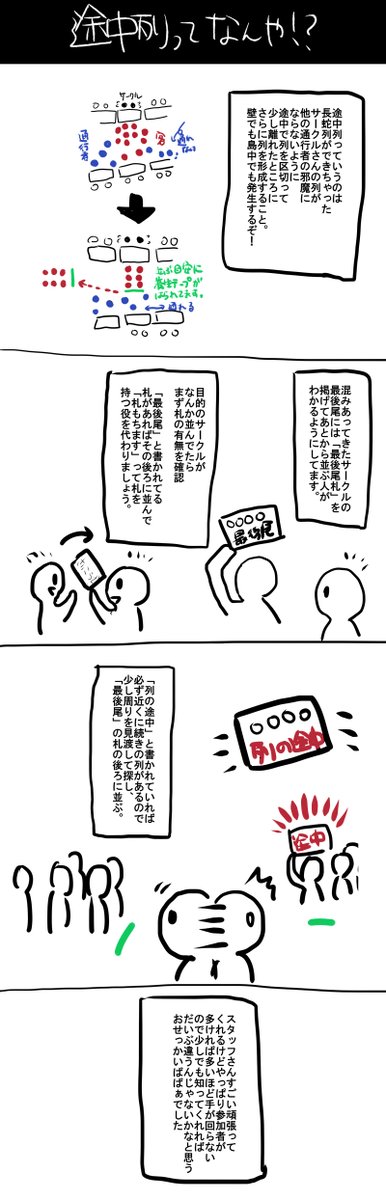 最後尾札、途中札がわかんないって人が多いわりに説明されてるツイなかったので。なんかぼんやりとでも知ってたらだいぶ違うかなって…せめて今日初参加とかのフォロワーさんに届けば……眠さと仕事前の20分くらいのあれだから手書きが読めないとかは、雰囲気で…いろいろ許して