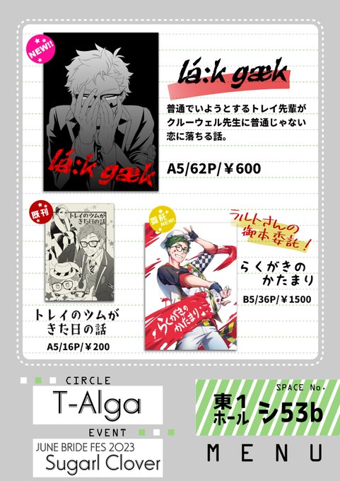 55 379 6/25 Sugary Clover 発行 クルトレ本⚗️♣️ ■ lɑːk gæk(らくがき)■ A5 / 62P /600円 普通であろうとする♣が普通じゃない恋におちた話。 ※♣のユニ魔の発現含め多くの捏造があります 23/06/18 23:12