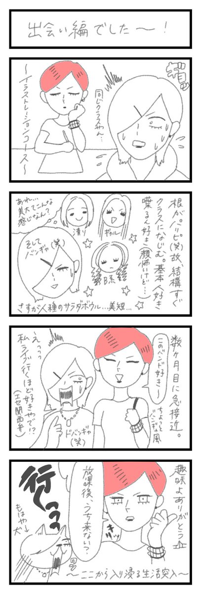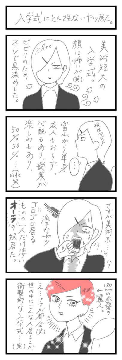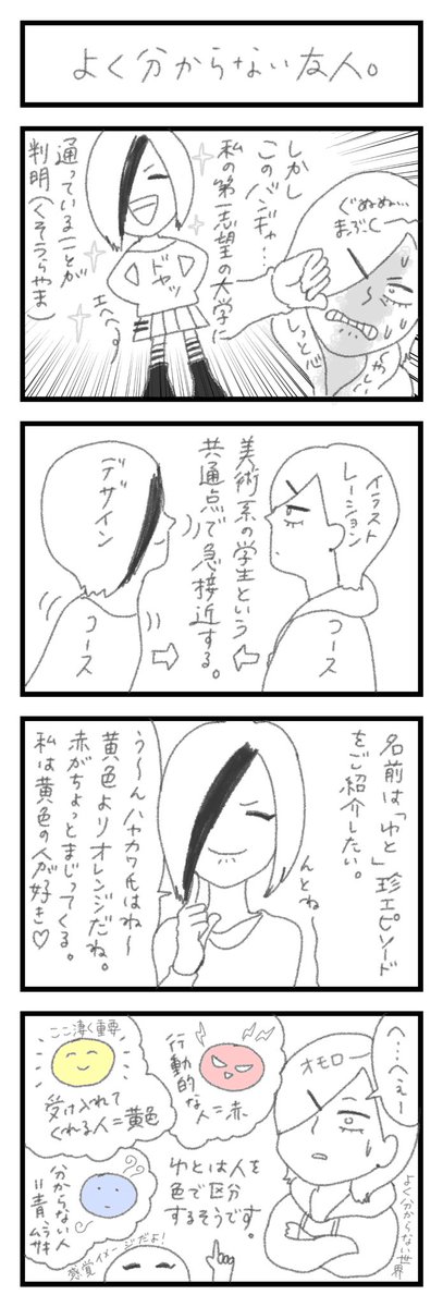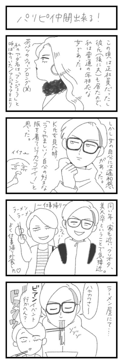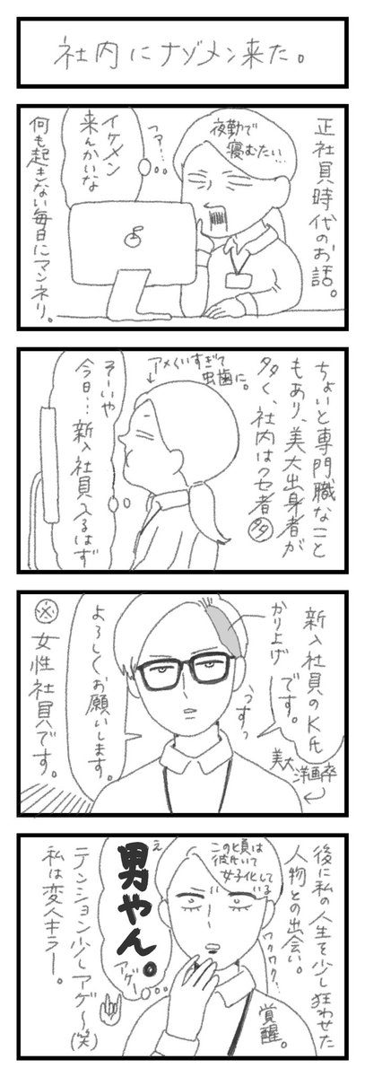 【妖精と出会った🧚♀️エッセイ漫画4】 個性的な同僚を介して、自分のジェンダーを自覚する話。繊細な話題ではありますが、世の中にこんな人たちが居るよ〜と、なんとなく伝わればいいなと😌楽しかった20代とともに振り返る🙌 (1/2)つづく🔥 #漫画が読めるハッシュタグ #四コマ #短編漫画