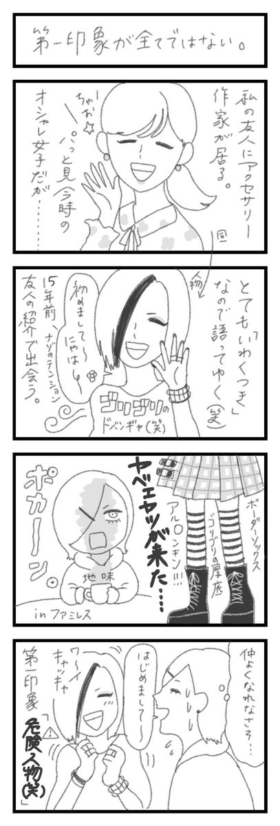 【妖精と出会った🧚♀️エッセイ漫画】 美人な友人を通して、自分のコンプレックスを自覚する話。弱さと対峙する! 今回は見た目問題をテーマにしました🪞 色々な意味で強烈な友人(漫画許可済笑) #漫画が読めるハッシュタグ #四コマ漫画 #マンガ