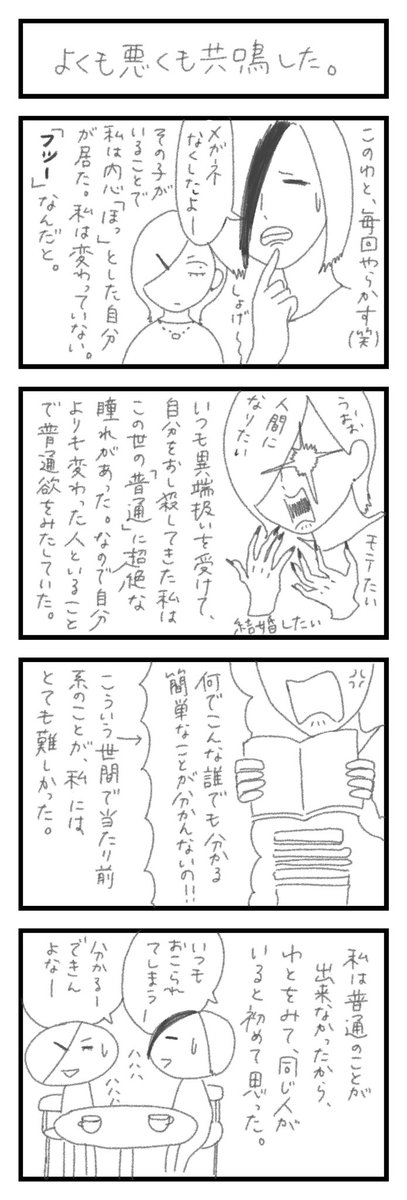 【妖精と出会った🧚♀️エッセイ漫画3】 強烈な個性を放つ友人を介して、自分のコンプレックスを自覚する話。弱さと対峙! 今回は『普通』に固執をテーマにしました。(漫画許可済笑)未だに普通に固執してしまう😂やめられん! (1/2)つづく! #漫画が読めるハッシュタグ #四コマ漫画 #マンガ