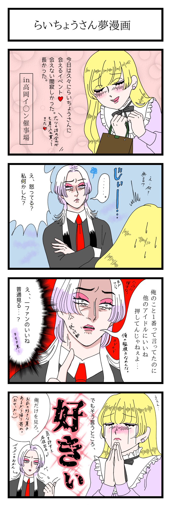 【らいちょうさん夢漫画🐦】 リアコ勢、M寄りのファン多め(笑)らいちょうさんに叱られたいとのリクエスト有り😂14日の誕生日に向けてどうしても描きたかった...!!性格はお節介で疑り深い。愛が重めなので、ファンのことは大体認知しています👍 #漫画が読めるハッシュタグ #こんらい