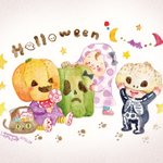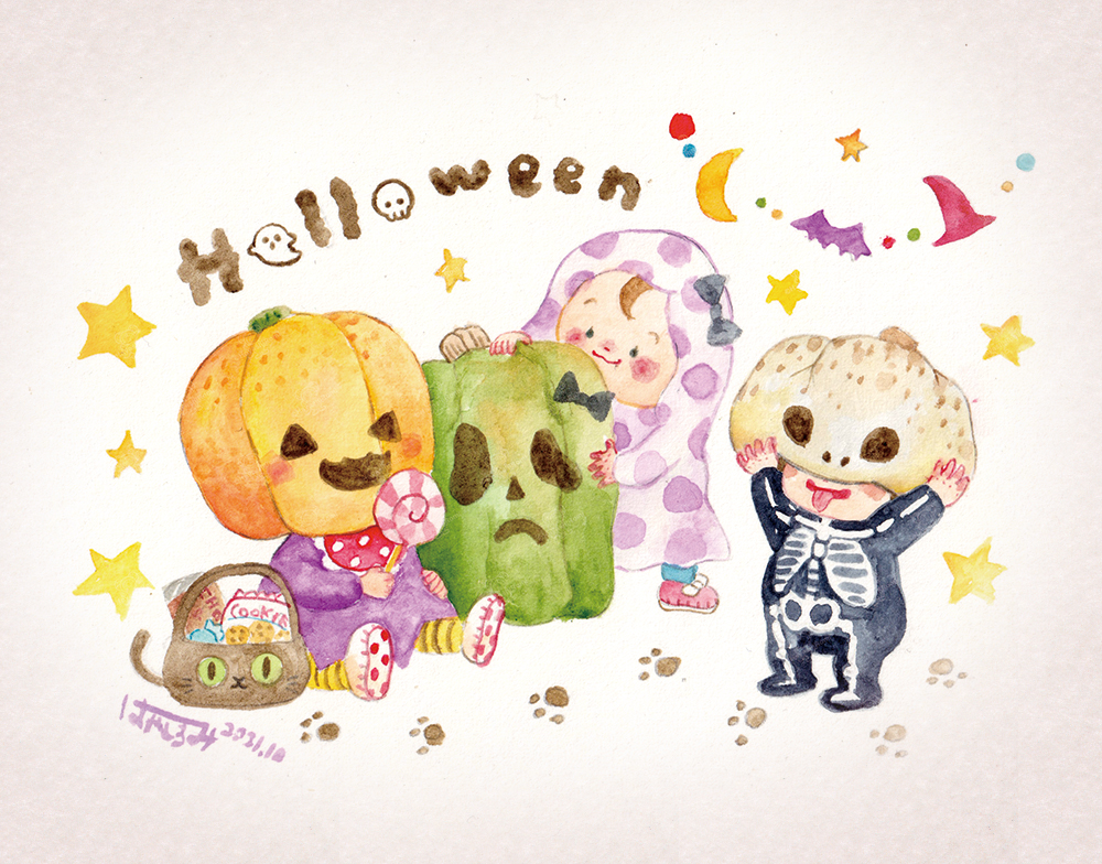 『ハロウィンの夜』(110×140mm,透明水彩,2021) 食いしん坊と怖がりと優しいお化けにふざけっ子。 バケツがおやつを集めてきてくれたよ🐈 #水彩イラスト #ハロウィンイラスト展示会2021 #Halloweenart #Halloween