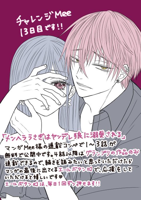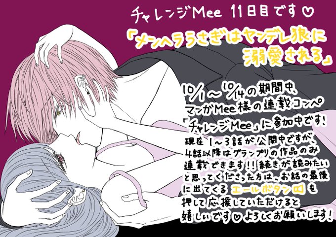 本日より連載コンペ #チャレンジMee に参加中です🥰 グランプリ作品は4話以降も連載できるので、面白いと思って頂けたらエールボタンを押して下さると嬉しいです🙏🏻10/1~14の期間中1日1回押せます📣 challenge-mee.manga-meets.jp/comics/e982a68… #マンガMeets #漫画が読めるハッシュタグ #マンガMee #メンヘラ #ヤンデレ