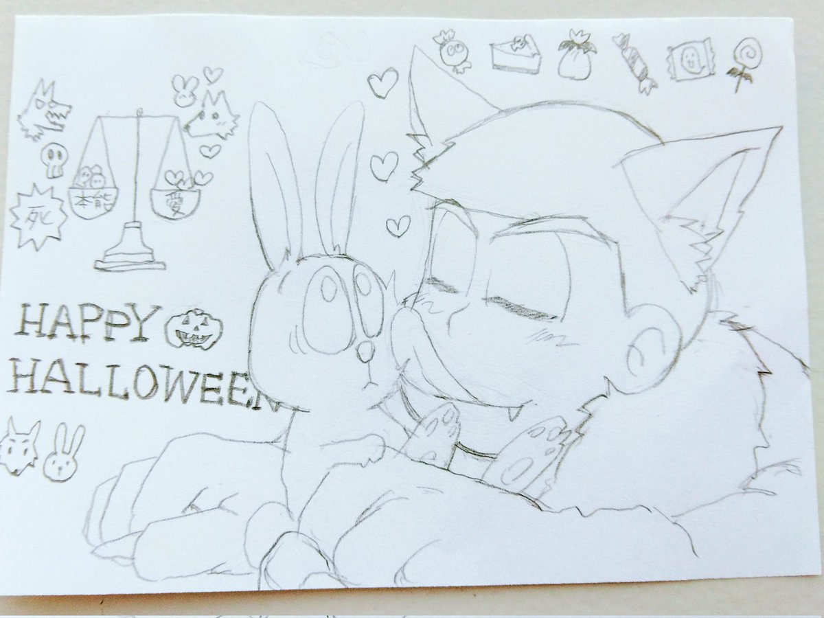 今描いた落書き🐺🐰 帰ったら仕上げようか…紙が小さすぎるから難しいけど、でもいい表情描けた気がする~