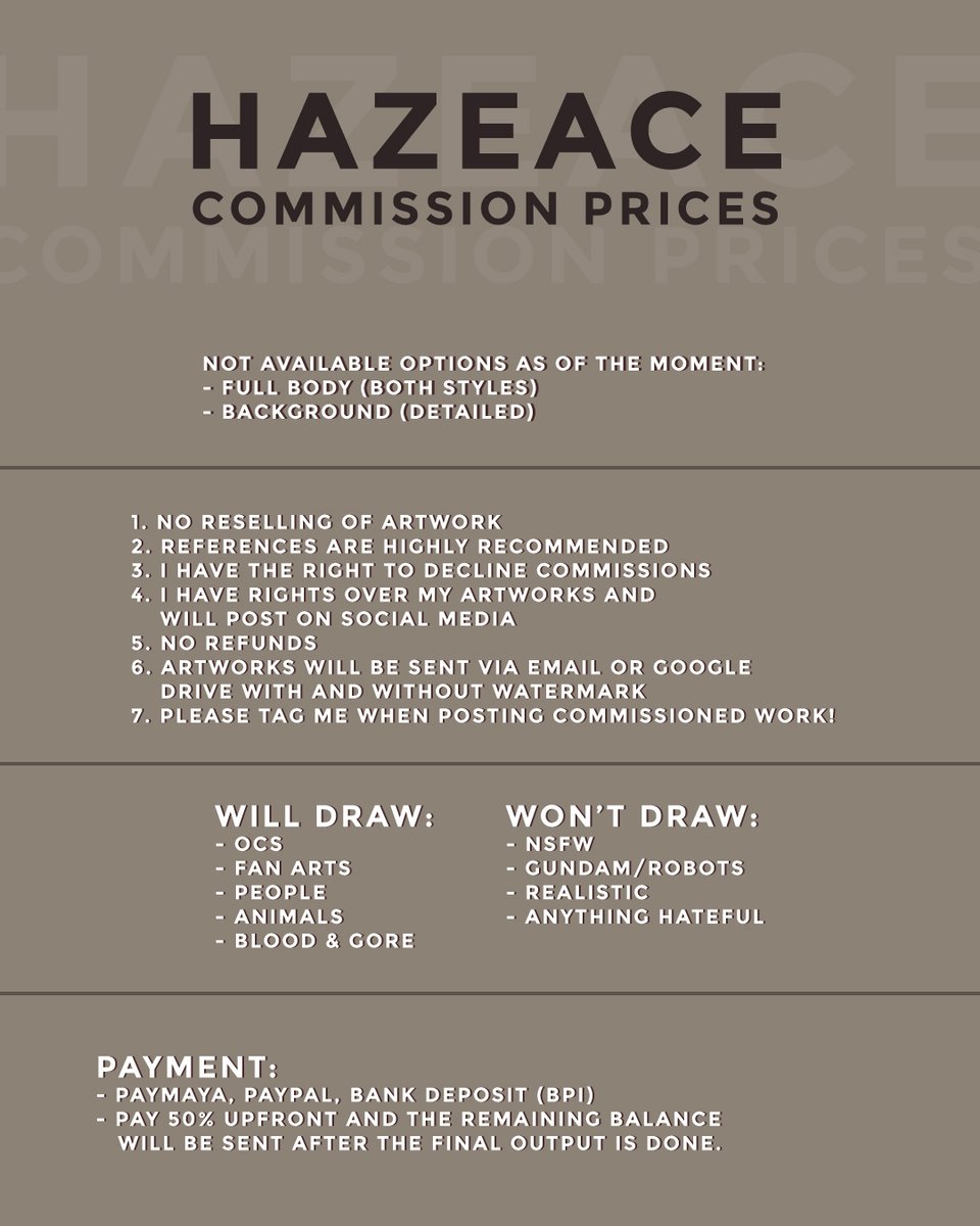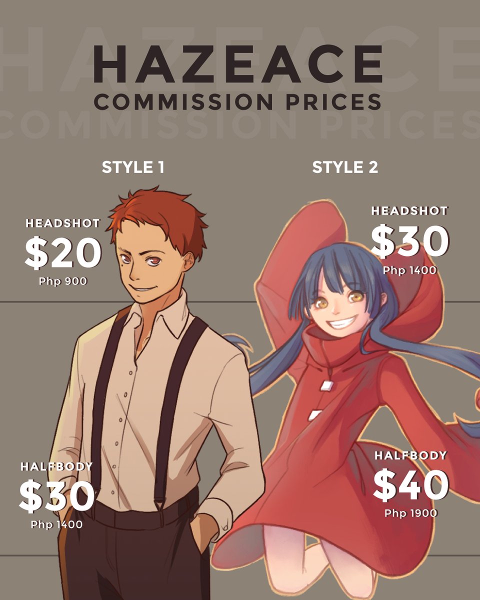 🍂COMMISSIONS OPEN!🍂 Hello! Updated commission sheet! RTs are highly appreciated! Kindly send me a dm or an email! More works at instagram.com/hazeace.art/ #commissionsopen #commission #CommissionSheet #artph #commissionart #commissionme