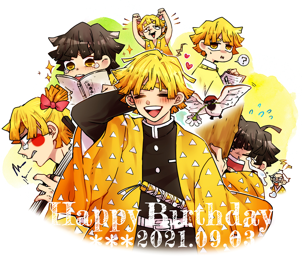 安定の遅刻…ッ おたおめでしたぁ!!早くアニメで三味線掻き鳴らしてる姿が見たいです!!!あとテンションで描いてたら善照が乱入してました……楽しかった😇😇😇😇💜 #我妻善逸誕生祭2021 #我妻善逸生誕祭2021